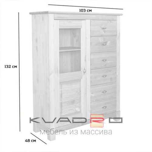 Широкая модель с шуфлядами и полками с распашными дверцами.