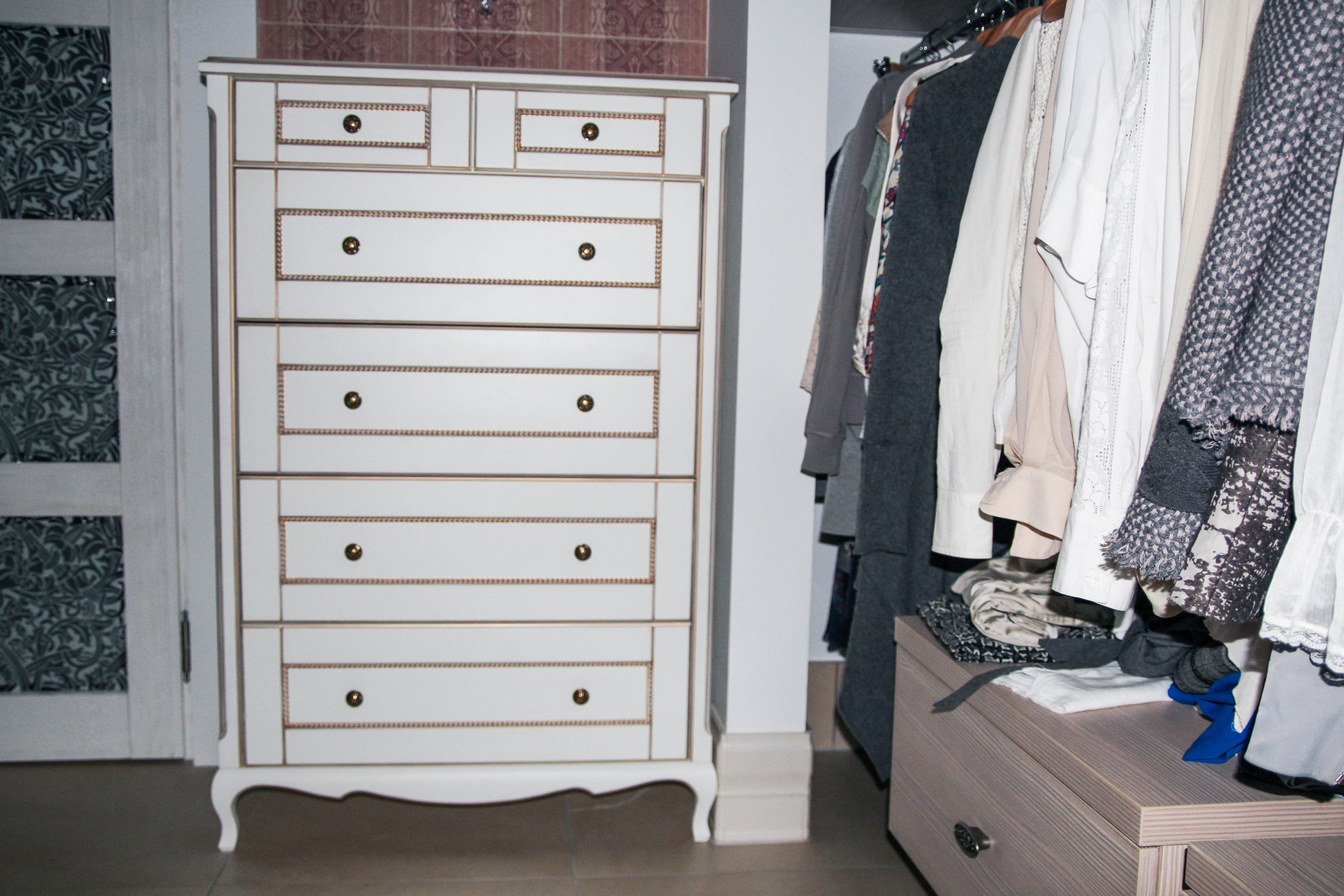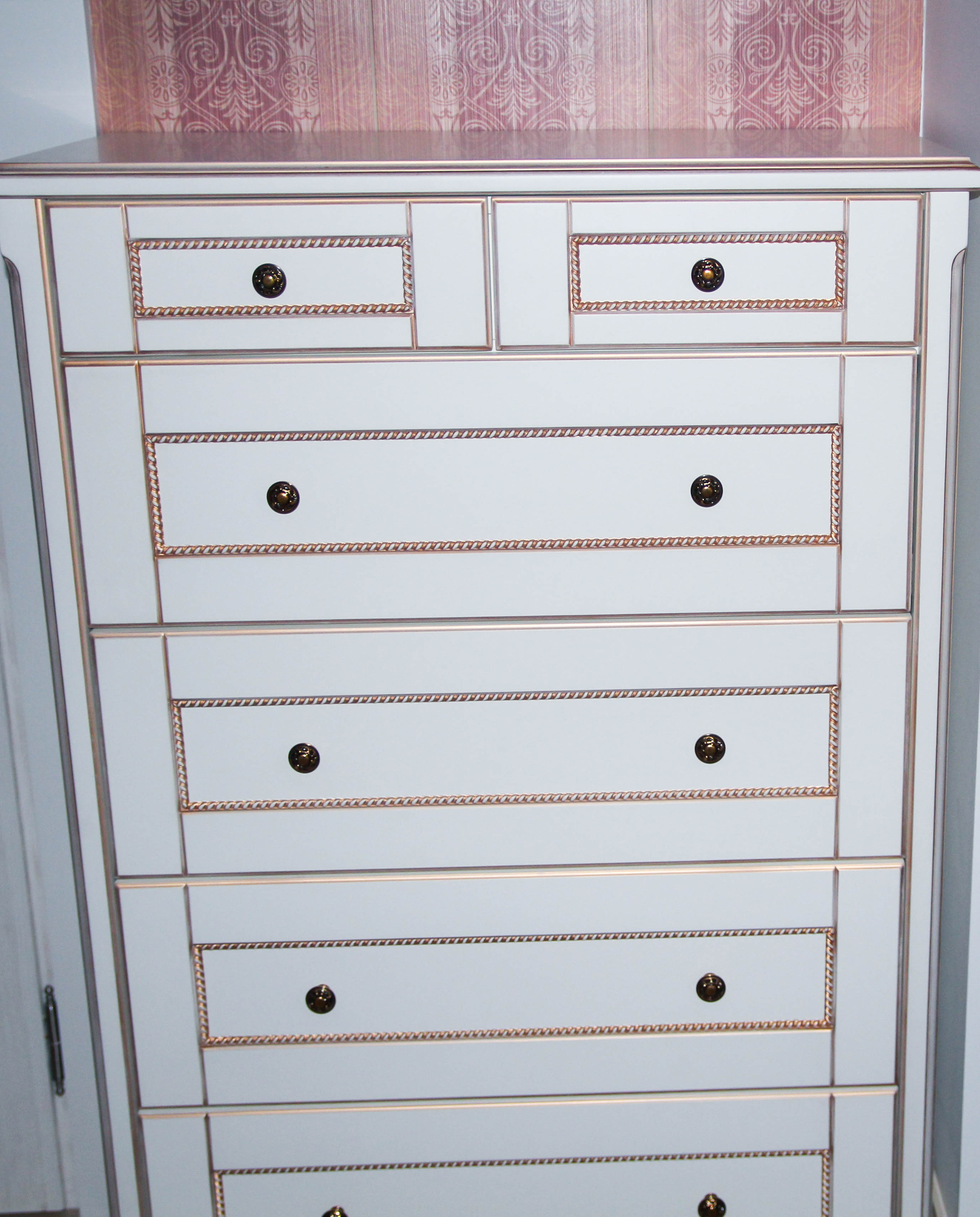 Стильный комод оборудован небольшими круглыми ручками с рисунком. Модель оформлена в стильных алюминиевых планках, подчеркивающих контуры выдвижных ящиков и фасада комода. Предусмотрены различные размеры выдвижных ящиков.