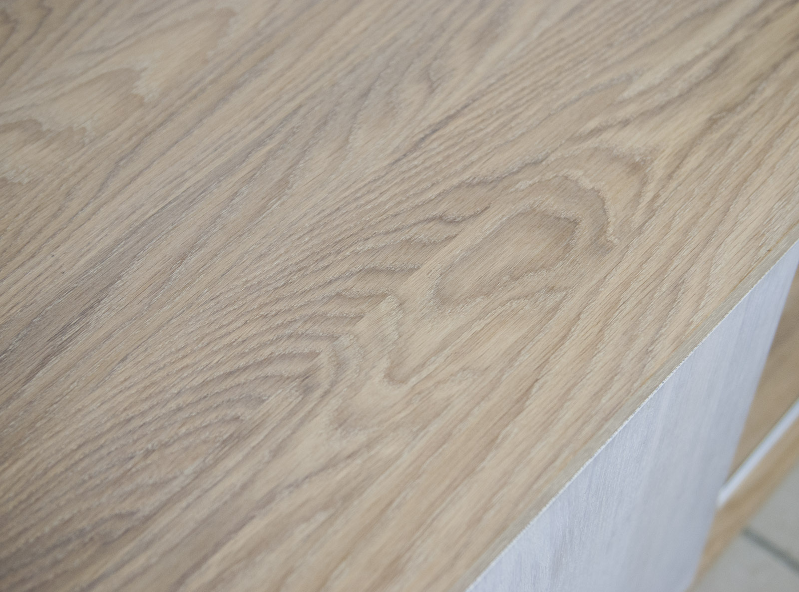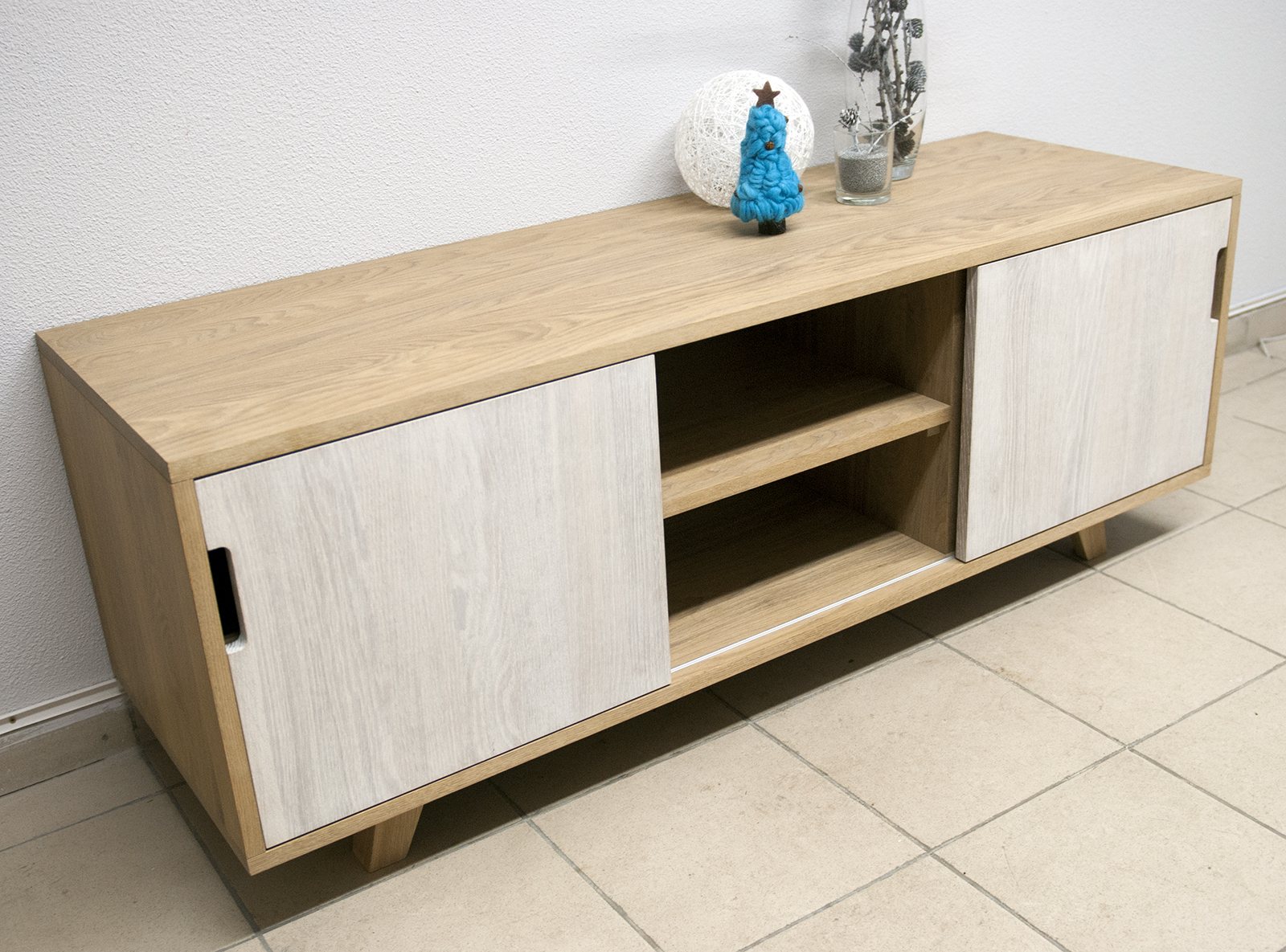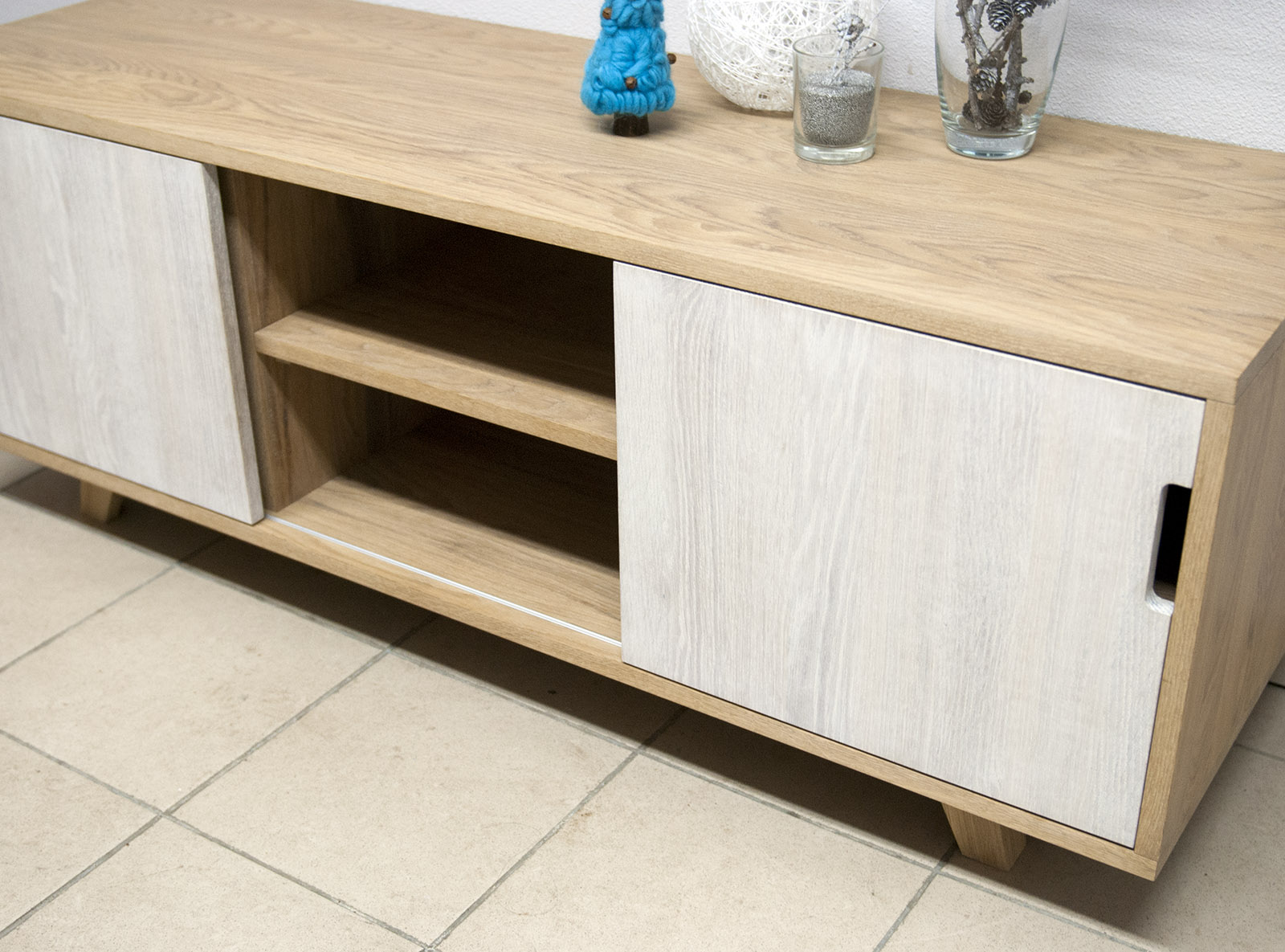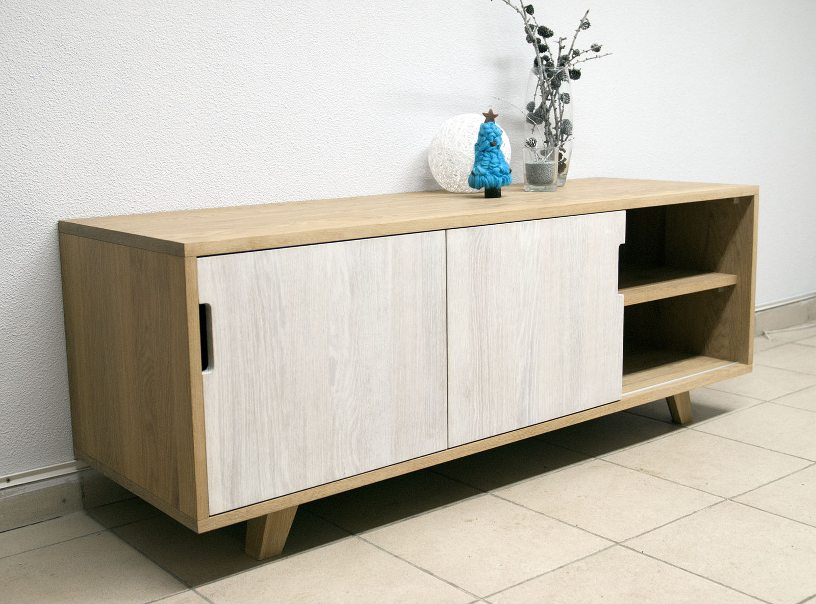 Тумба из массива дуба с оригинальным дизайном ручек и раздвижными дверцами, закрывающими несколько широких полок.