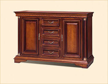 Широкий комод в викторианском классическом стиле. Отделы на дверцах с филенками и ручками-каплями симметрично расположены по краям комода, по центру - четыре небольших выдвижных ящика со складными ручками. Фрезерованное основание и резная кромка фасада под крышкой.