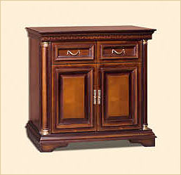 Двухдверная тумба с двумя выдвижными ящиками под крышкой. Узор резьбой по дереву на кромке крышки, массивное основание и дверцы с филенками. Тумба изготовлена из натурального массива в классическом антикварном стиле.