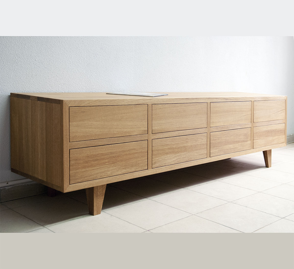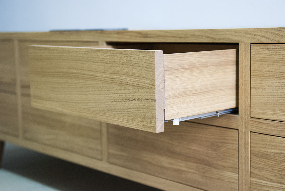 Современная тумба под телевизор выполнена из массива дуба, оснащена системой открывания нажатием на фасад (Blum Tandem Tipon) и скрытыми направляющими полного выдвижения. Цвет на примере – изысканный Bourbon. Тумба под телевизор может быть изготовлена специально под вашу гостиную. Размеры, цвет, количество ящиков и их фурнитуру можно изменять под ваши требования.