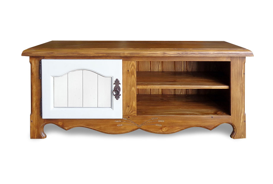 Деревянная тумбочка под телевизор в натуральной расцветке корпуса и одной дверцей в белой эмали. Открытая ниша на две полки, фасад украшен фрезеровкой и тисненым узором.