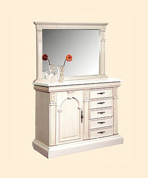 Светлоокрашенный комод из массива в барочном стиле и обильным резным декором. Отдел на дверце с арочной филенкой, вторую половину занимает блок на шесть выдвижных ящиков. Массивное основание и крышка. Маленькие круглые ручки-кнопки под состаренную бронзу.
