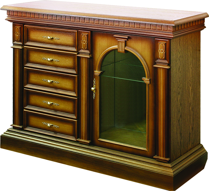 Широкий комод с элементами стилей барокко и классики. Витрина за арочной дверцей со стеклаянной полкой и зеркальной тыльной стенкой рядом с блоком на пять нешироких выдвижных ящиков. Масивное основание и крышка, а также фасад с ручками-кнопками украшены резьбой.