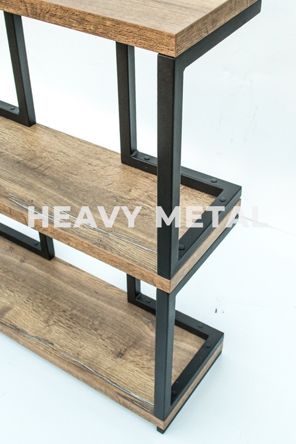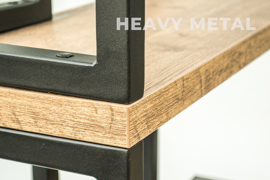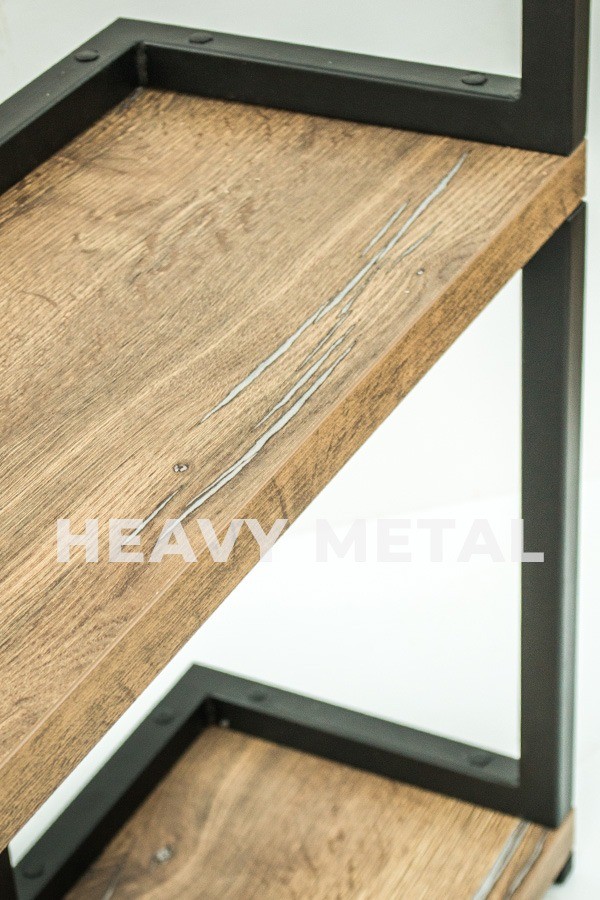 Консоль, достаточно вместительная и практичная. Такой брутальный и дерзкий вид, изделию придают массивные полки толщиной 36 мм. Сам каркас выполнен из профильной трубы 30х30 мм. Расстояние между полками составляет 450 мм.