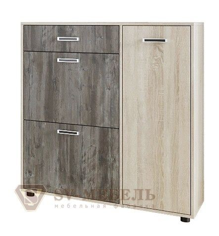 Комод комплектуется выкатным ящиком, двумя отделениями для обуви и отделением со створкой в две полки.
