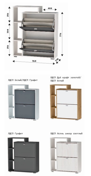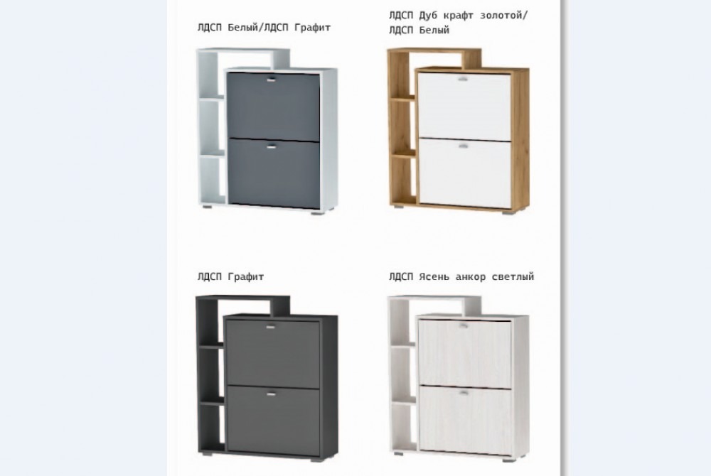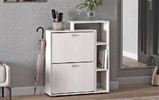 Обувница с двумя откидными створками и открытыми полками для мелких предметов, удобна и проста в использовании. Она поможет организовать аккуратное и компактное хранение обуви, надёжно защитит её от физического воздействия.