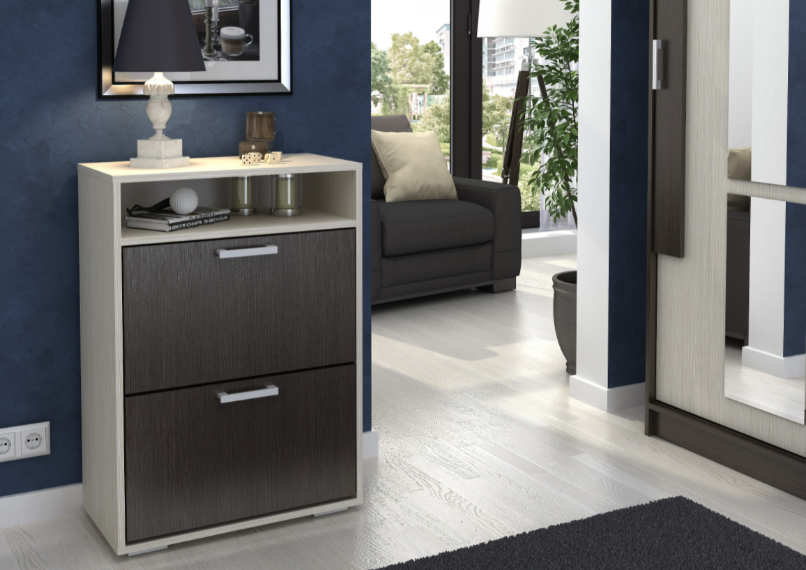 Тумба для обуви с полками и ящиком выполнена из ЛДСП в цвете темного венге.