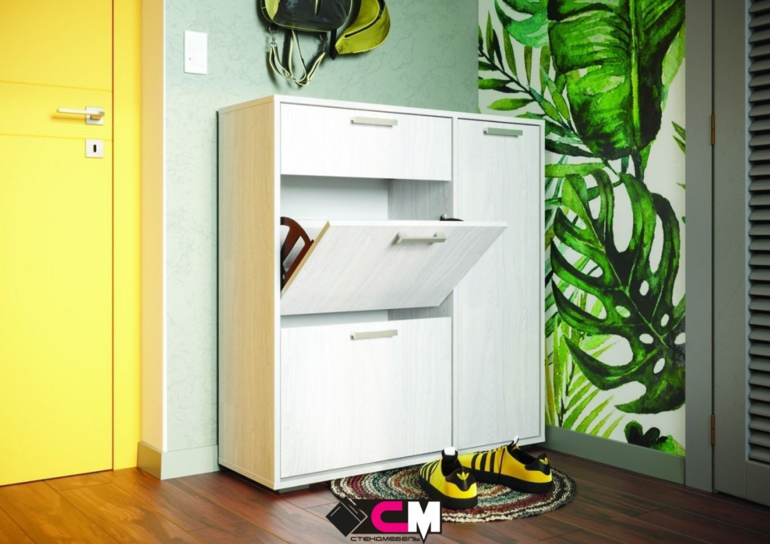 Темная тумба для хранения обуви. Глубина отделения – 45 см.