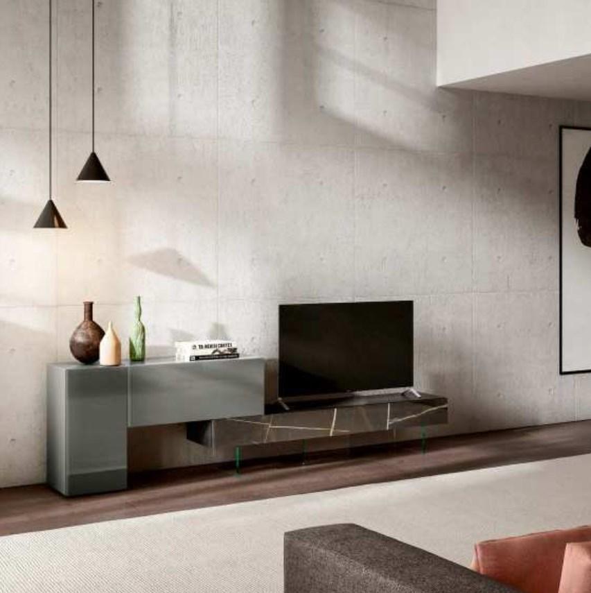 Серая ТВ-тумба с ассиметричным дизайном