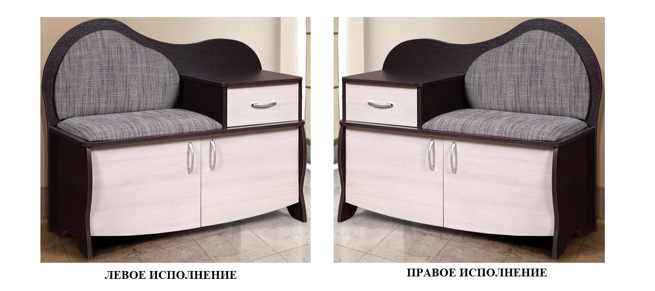 Материал: каркас/фасад – ламинированная ДСП; кромка - ПВХ 0,45÷2мм; сиденье/пинка - поролон, ткань; ручки – пластик