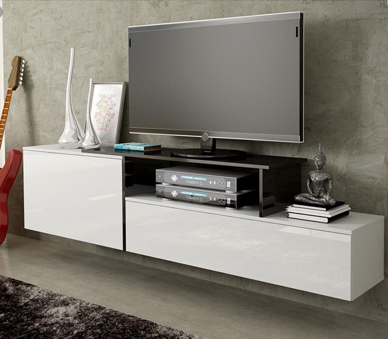 Закрытый глянцевый фасад с контрастной черной подставкой под ТВ.