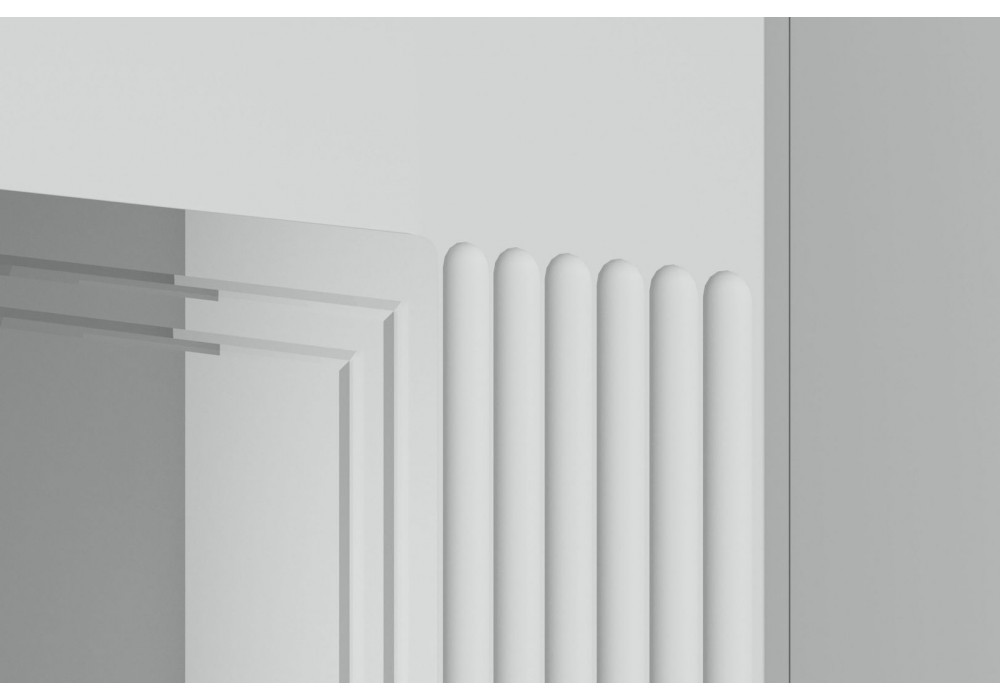 Фасады выполнены из МДФ и покрыты эмалью белого цвета. Корпус ЛДСП в цвете Белый снег. Стиль коллекции задает модная вертикальная фрезеровка фасадов и оригинальная фурнитура