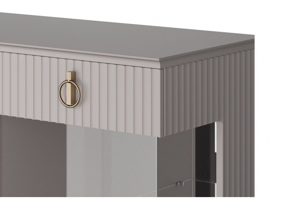 Фасады выполнены из МДФ и покрыты эмалью льняного цвета. Корпус ЛДСП в цвете "Персидский жемчуг". Стиль коллекции задает модная вертикальная фрезеровка фасадов и оригинальная фурнитура золотого цвета.