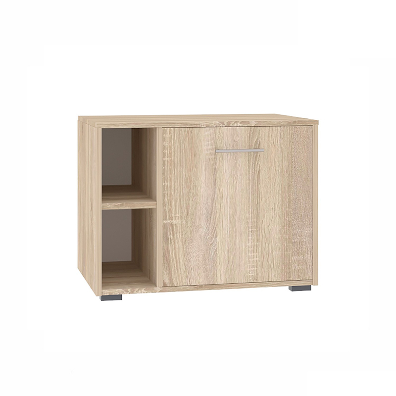 Тумба для обуви из ЛДСП в декоре березы. Два отрытых и два закрытых отделения с полкой.