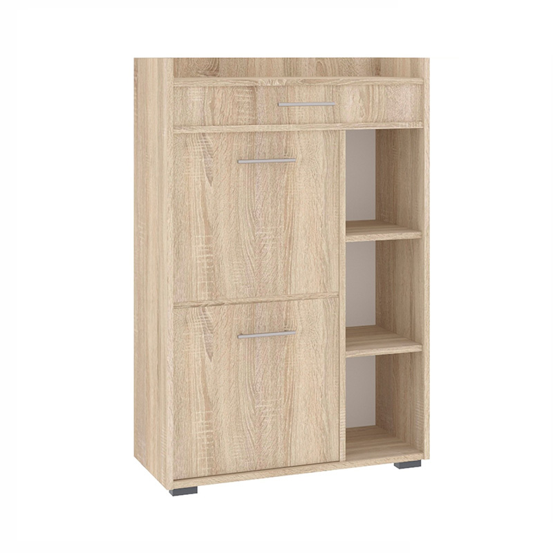 Светлая обувная тумба с фактурой дуба сономы. Имеет открытые и закрытые полки, выдвижной ящик.
