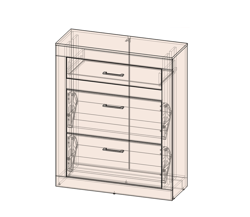 Открывание путем захвата снизу ящика (предусмотрен технологический зазор (16мм)).