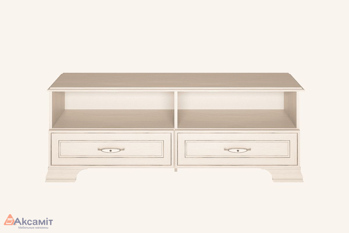 Большая и современная тумба для телеаппаратуры станет удобным и надежным предметом интерьера гостиной. Тумба включает включает в себя две открытые ниши и два выдвижных ящика для хранения личных вещей. Ручки цвета "Хром глянцевый" сделаны из металла и оснащены белыми вставками. Входит в набор мебели для гостиной Венеция, выполненный в лучших классических традициях.