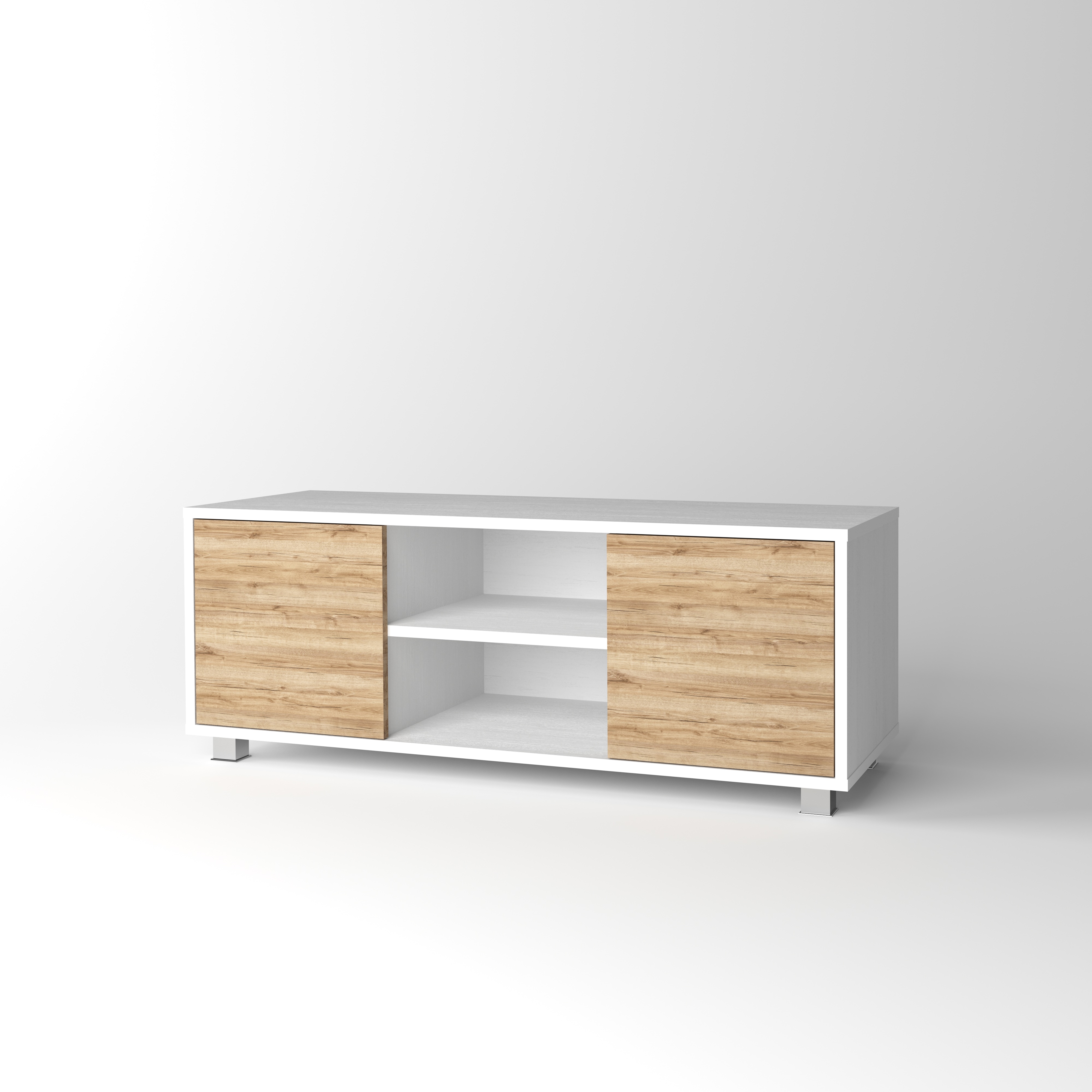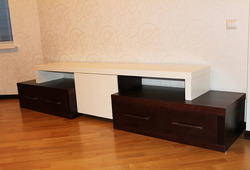 Широкая тумба с двумя распашными отделениями и выдвижными ящиками.