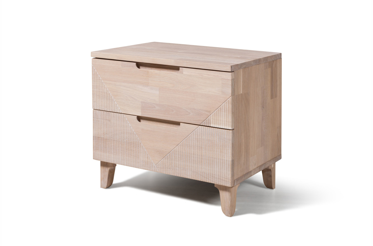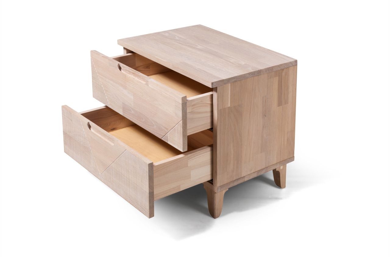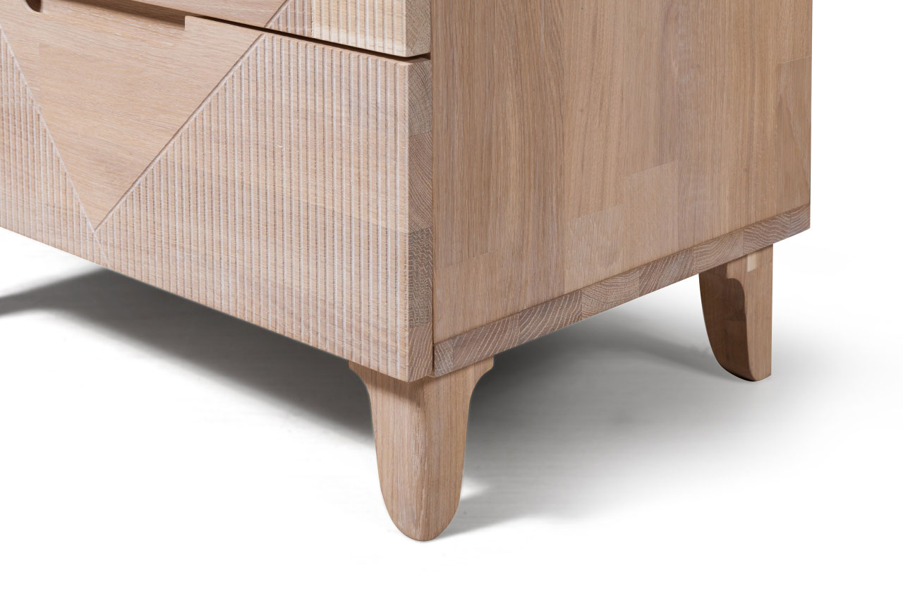 Тумбочка с двумя шуфлядами из массива дуба. Фурнитура скрытого монтажа с доводчиком. Главный акцент сделан на особый вид отделки фасадов – рельефную фрезеровку.