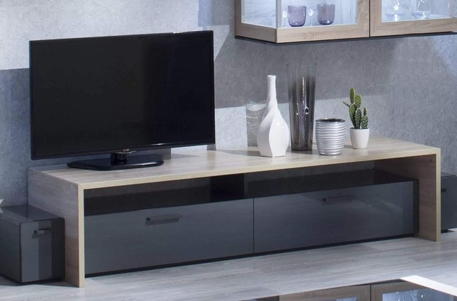 Современная модель тумбы для гостиной. Оснащена открытыми нишами и двумя ящиками.