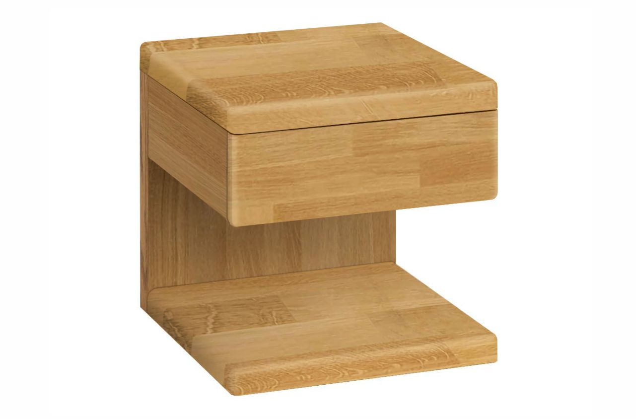 Тумба прикроватная из массива дуба с одним выдвижным ящиком. Фурнитура скрытого монтажа с доводчиком с механизмом «push to open», дно ящика выполнено из фанеры.
