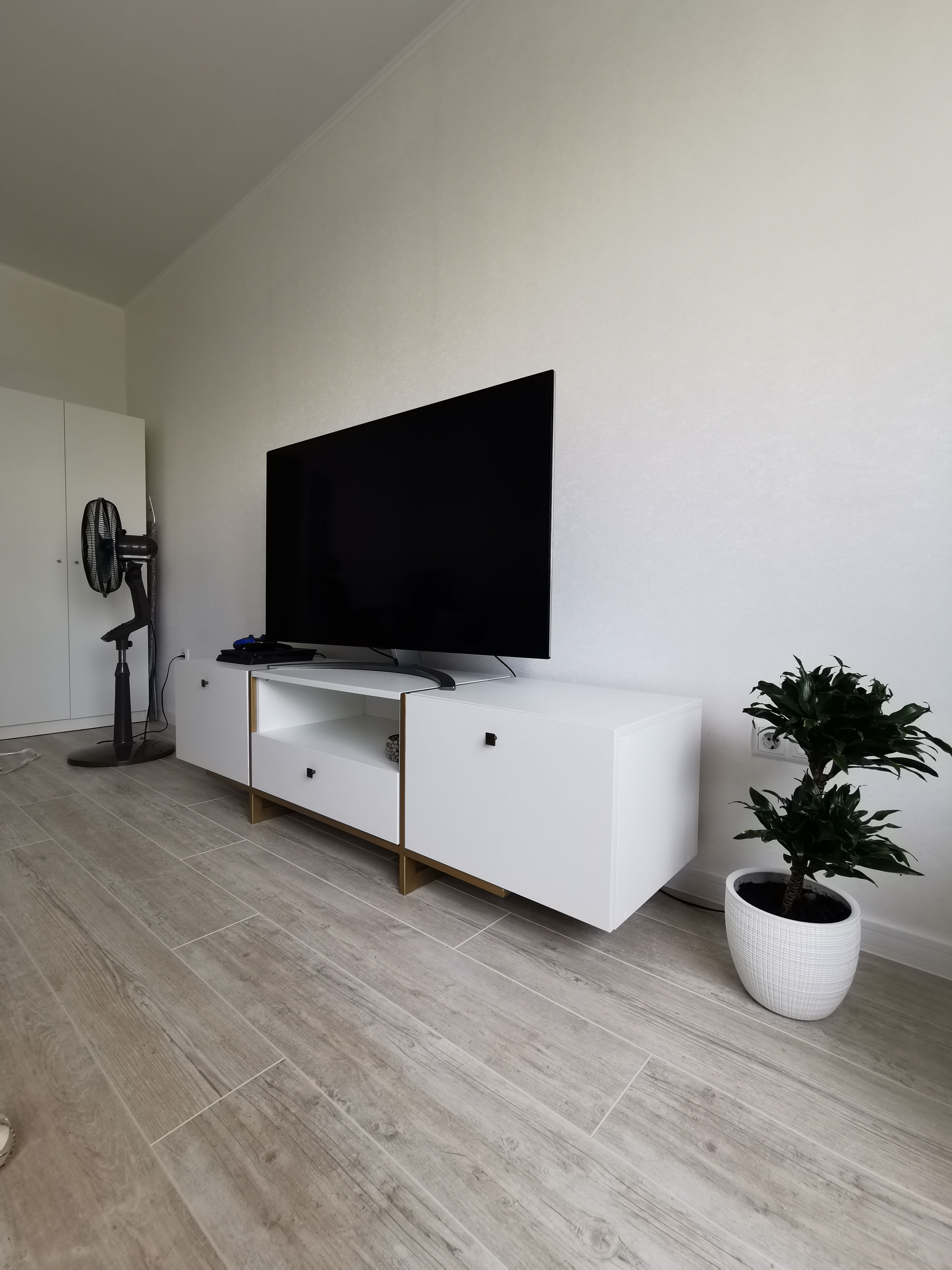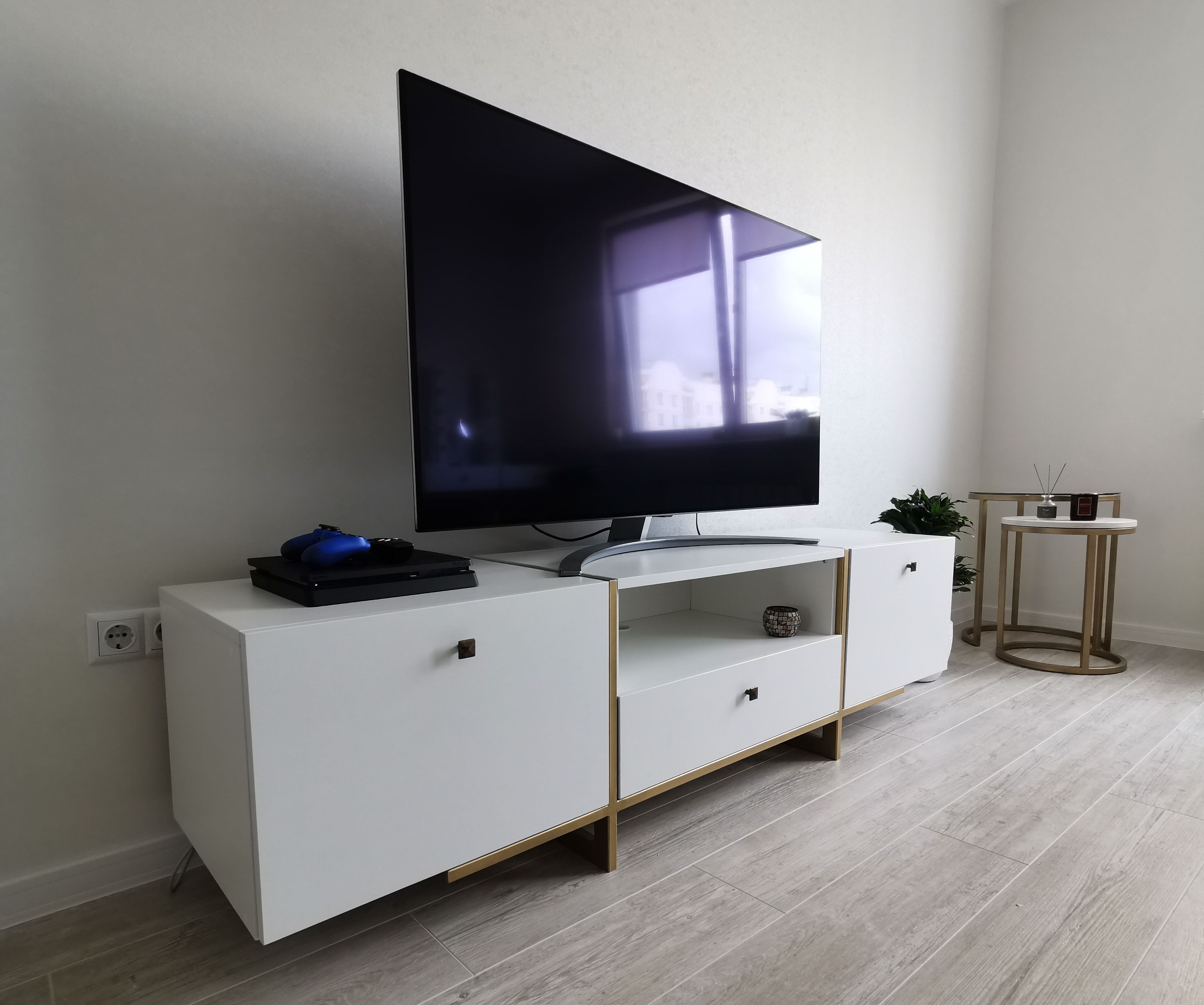 Современная тумба под ТВ со шкафчиками для хранения.