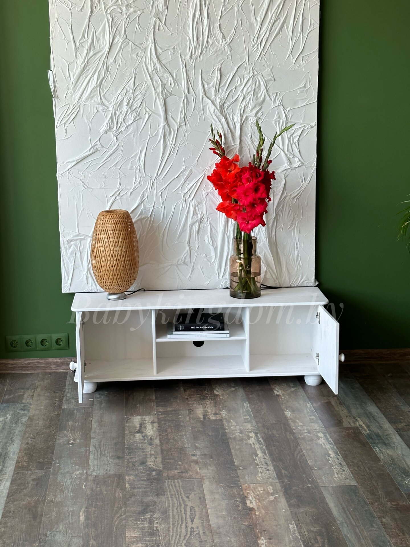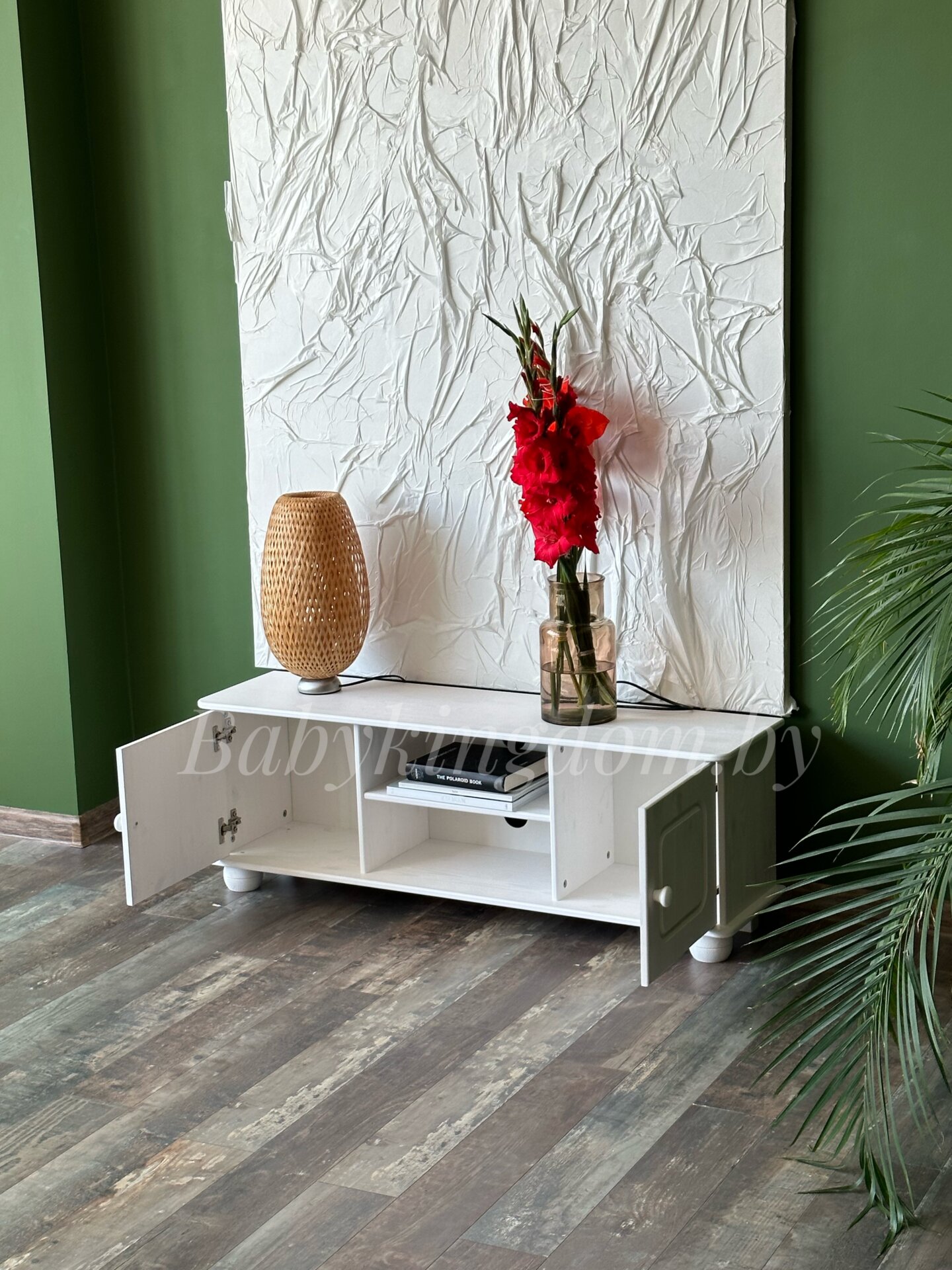 Тумба под ТВ в белом цвете с закругленными углами. Без ручек.