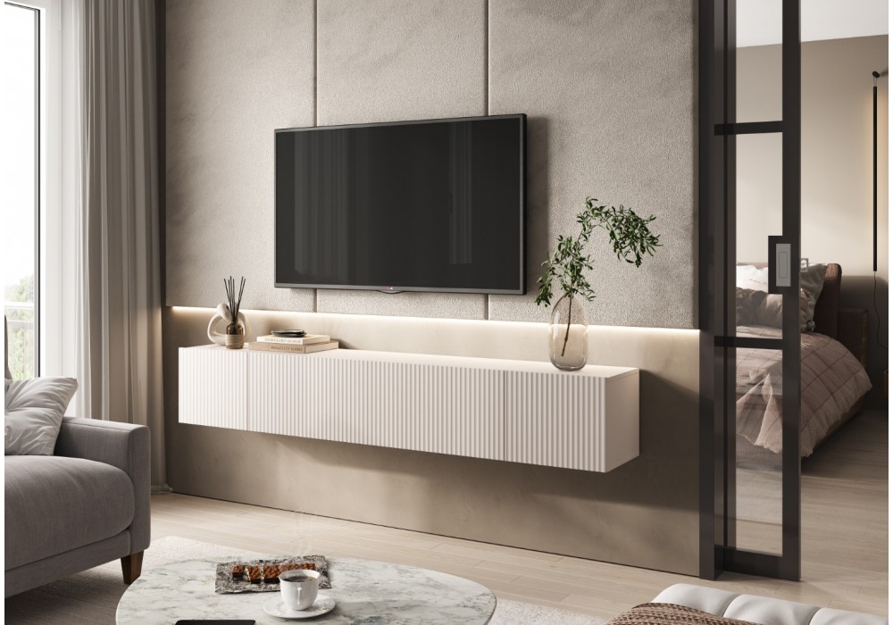 Тумба навесная под ТВ «Оскар» - элегантное и вместительное решение для Вашей гостиной. Тумба включает в себя закрытое пространство с полками и открытую нишу сверху. На внутренних полках можно разместить книги, журналы и ТВ-принадлежности. Фактурные фрезерованные фасады из МДФ выполнены без ручек, открываются простым нажатием на край створки.