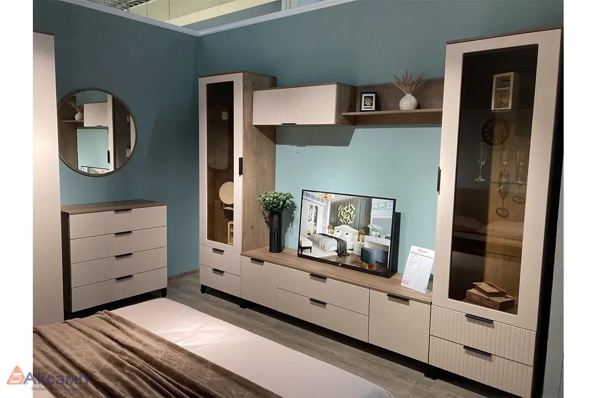 - Фасады: МДФ (16 мм) 1-сторонняя, пленка ПФХ "бисквит", стекло накладное (т.4 мм)
