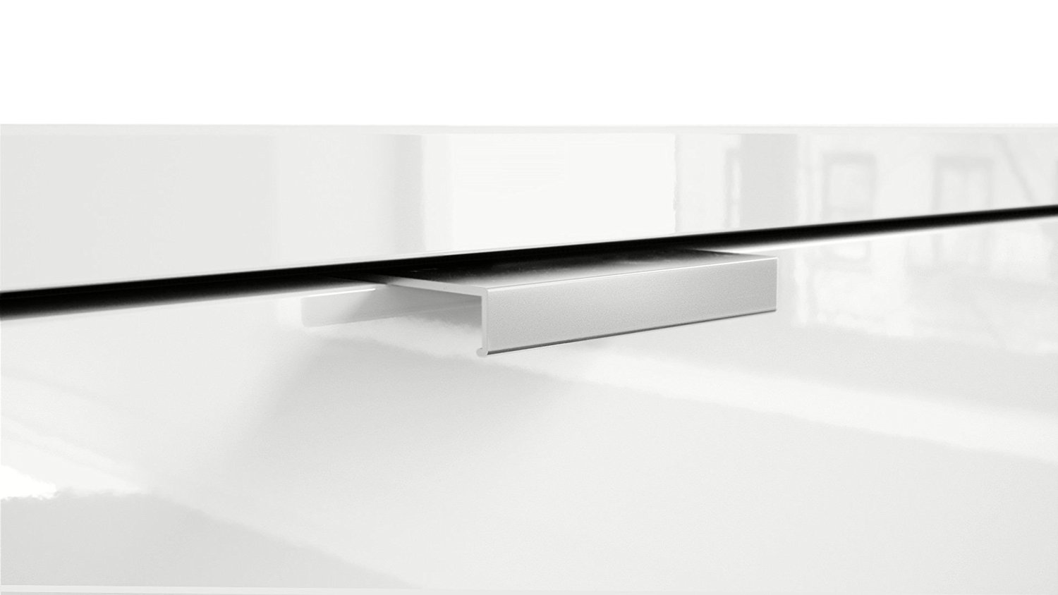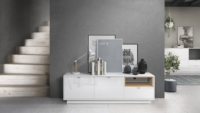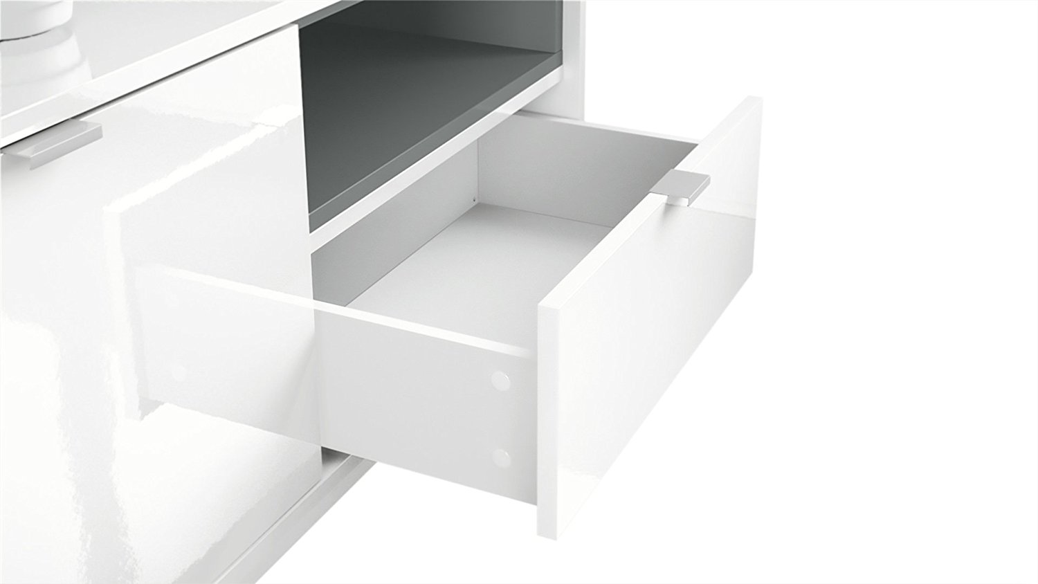Тумба под ТВ TU1 представлена в минималистическом стиле в белом цвете и дополнена в глянцевыми переливами. В модель встроены две дверцы, выдвижной ящик и ниша для электроприборов, оборудованная подсветкой.