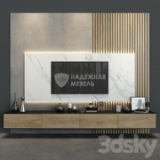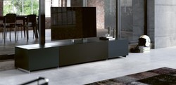 Современная модель тумбы для гостиной. Оснащена открытыми нишами и двумя ящиками.