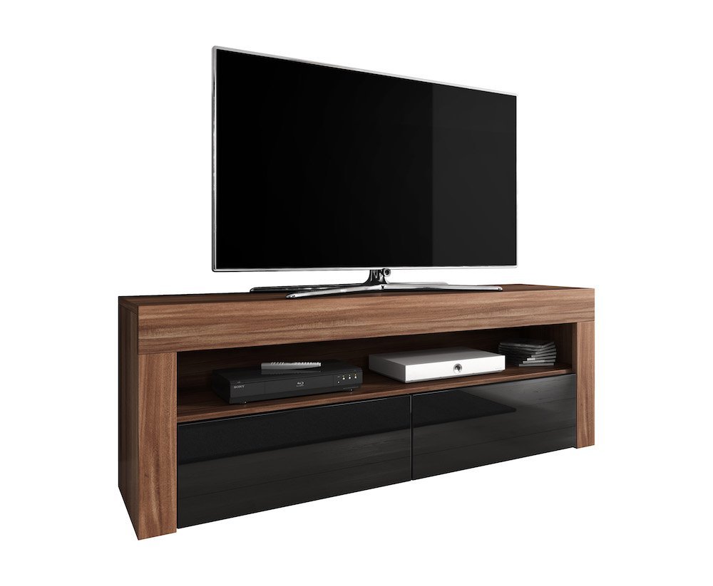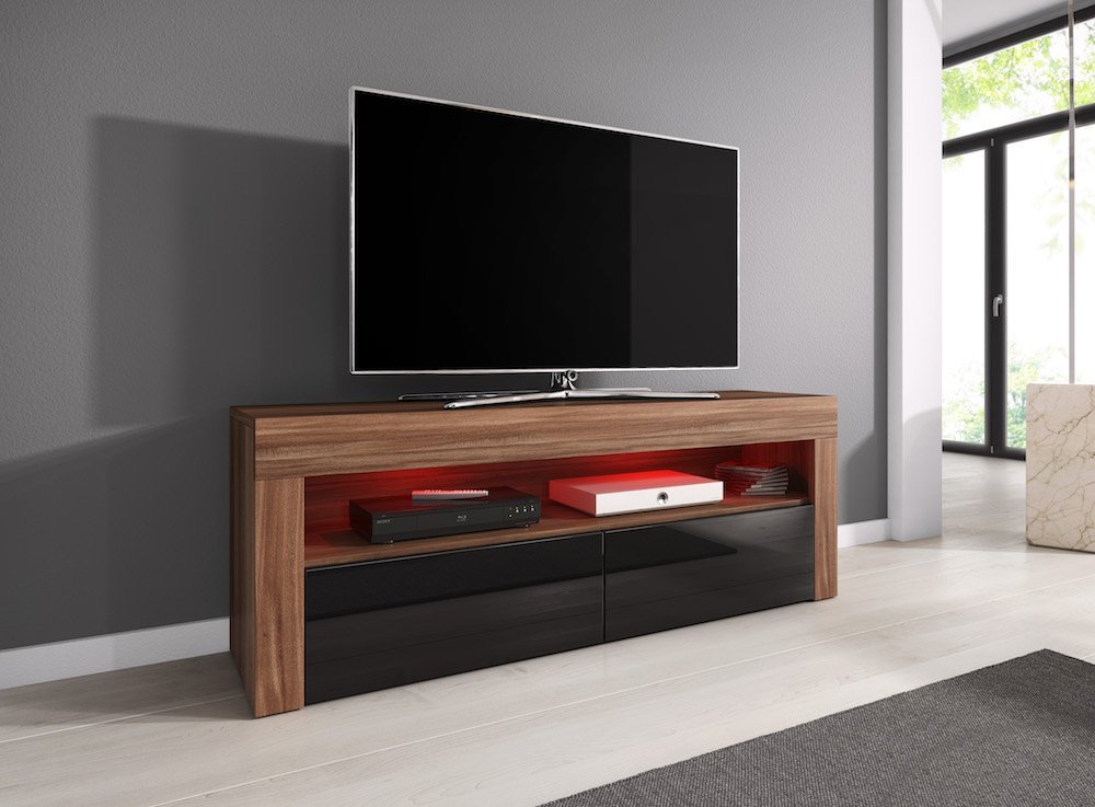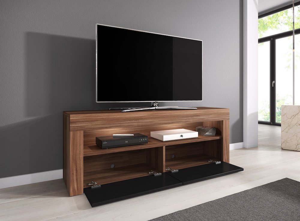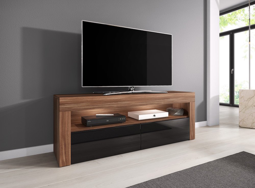 Сочетание древесного и черного цветов характерно фасаду данной модели. В ней нет ничего лишнего. Главная особенность тумбы под ТВ TY1 компактной формы – это подсветка, которая будет делать в помещении особую атмосферу.