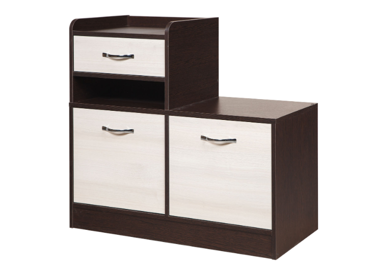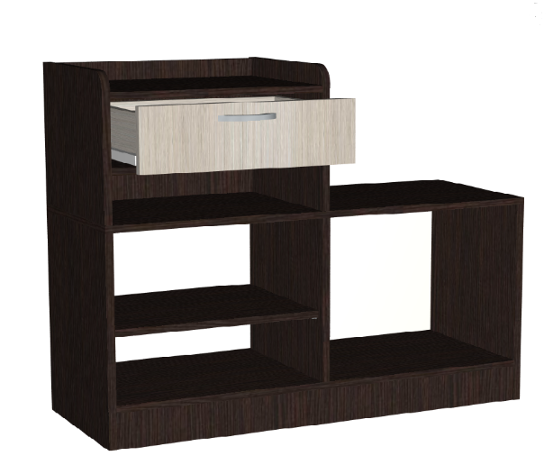 Тумба выполнена из ЛДСП и имеет нишу, полки и выдвижной ящик.