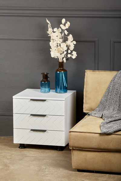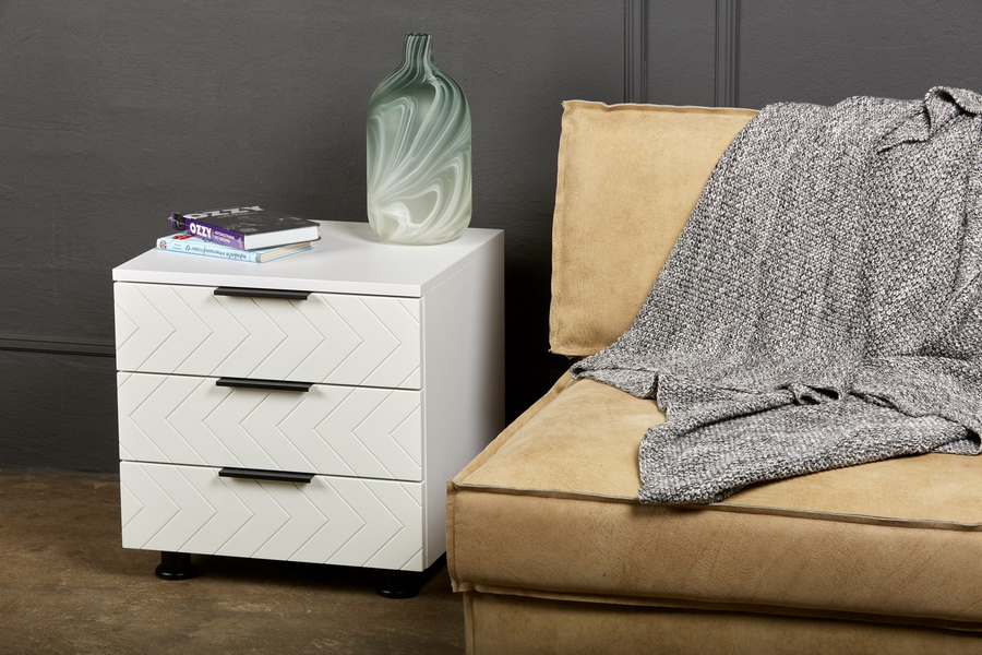 Всё это успешно совместит в себе наша новая прикроватная тумба из высококачественного ЛДСП и шпонированного МДФ с фрезеровкой в белом цвете. Три выдвижные ящика не только вместительны, но также предусмотрительно беззвучны: открывая необходимый ящик, вы не разбудите других членов вашей семьи. Ножки выполнены из натурального дуба, поэтому она будет крепко стоять на ногах и прослужит долгую службу на страже вашего сна и спокойствия.