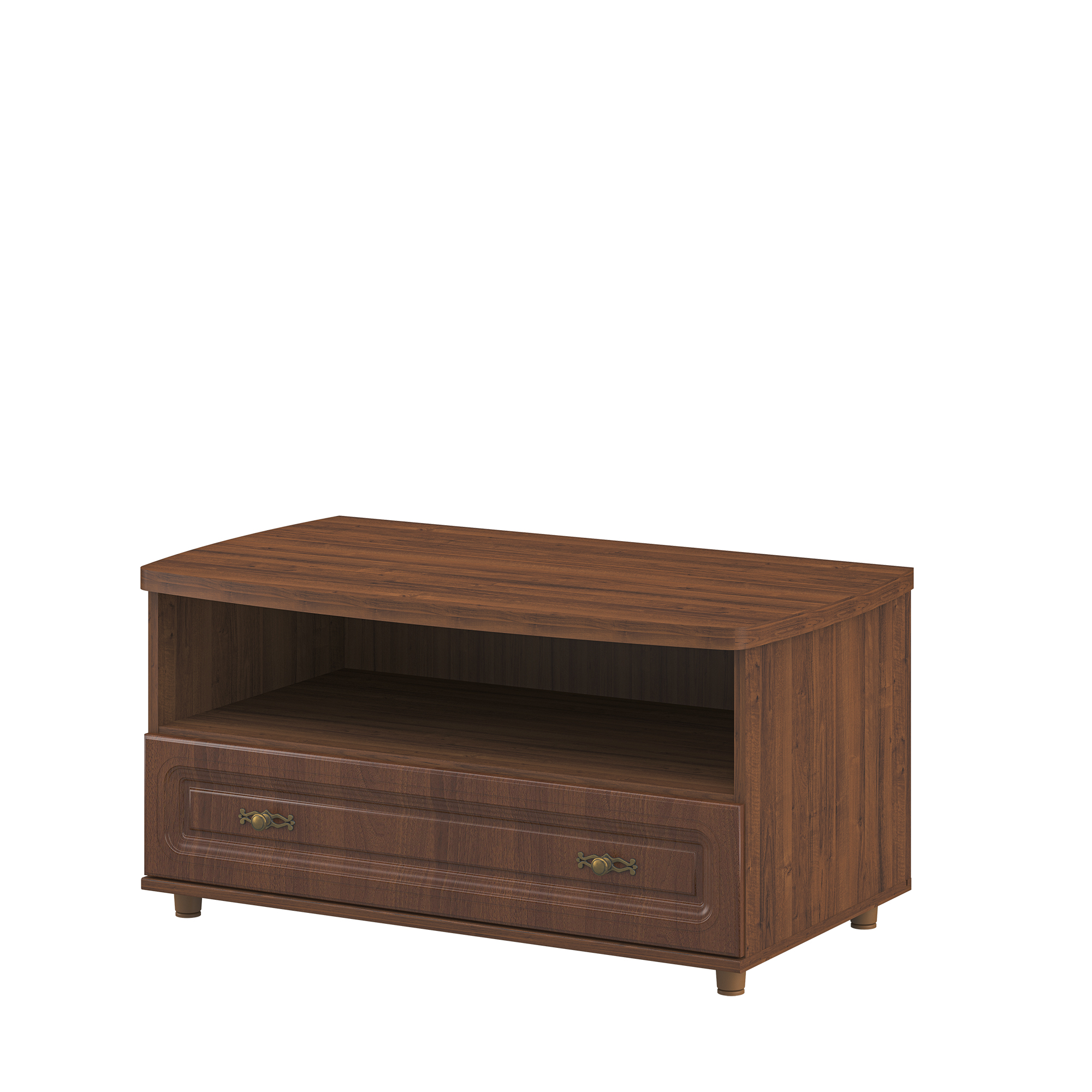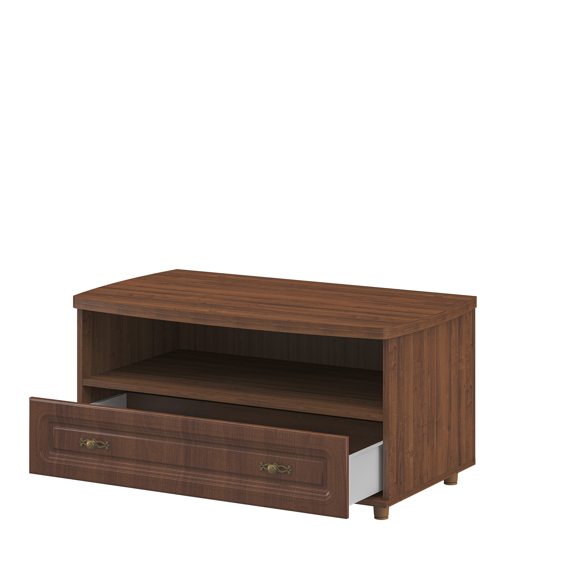 Тумба выполнена из ЛДСП и имеет нишу, полки и выдвижной ящик.