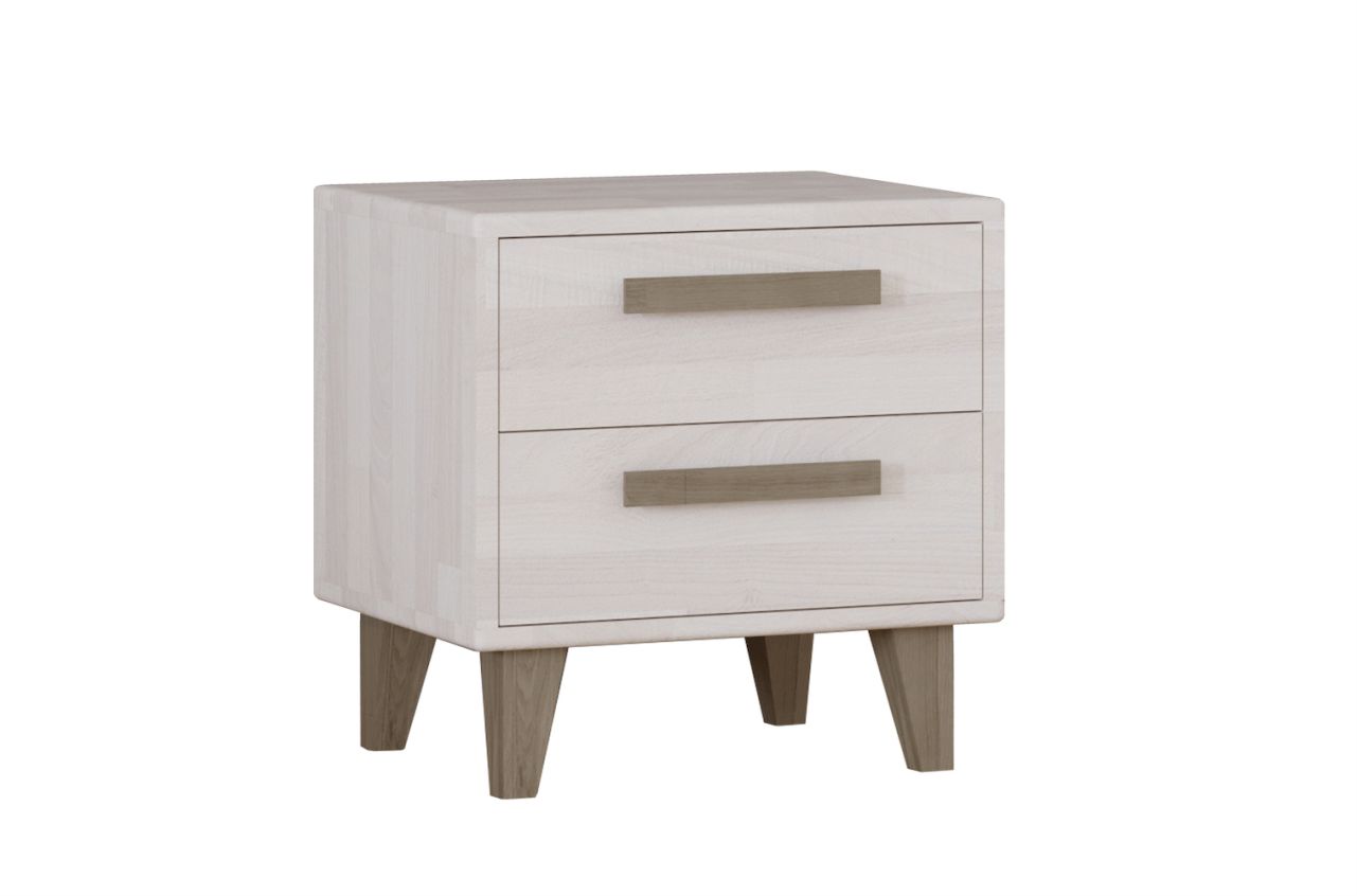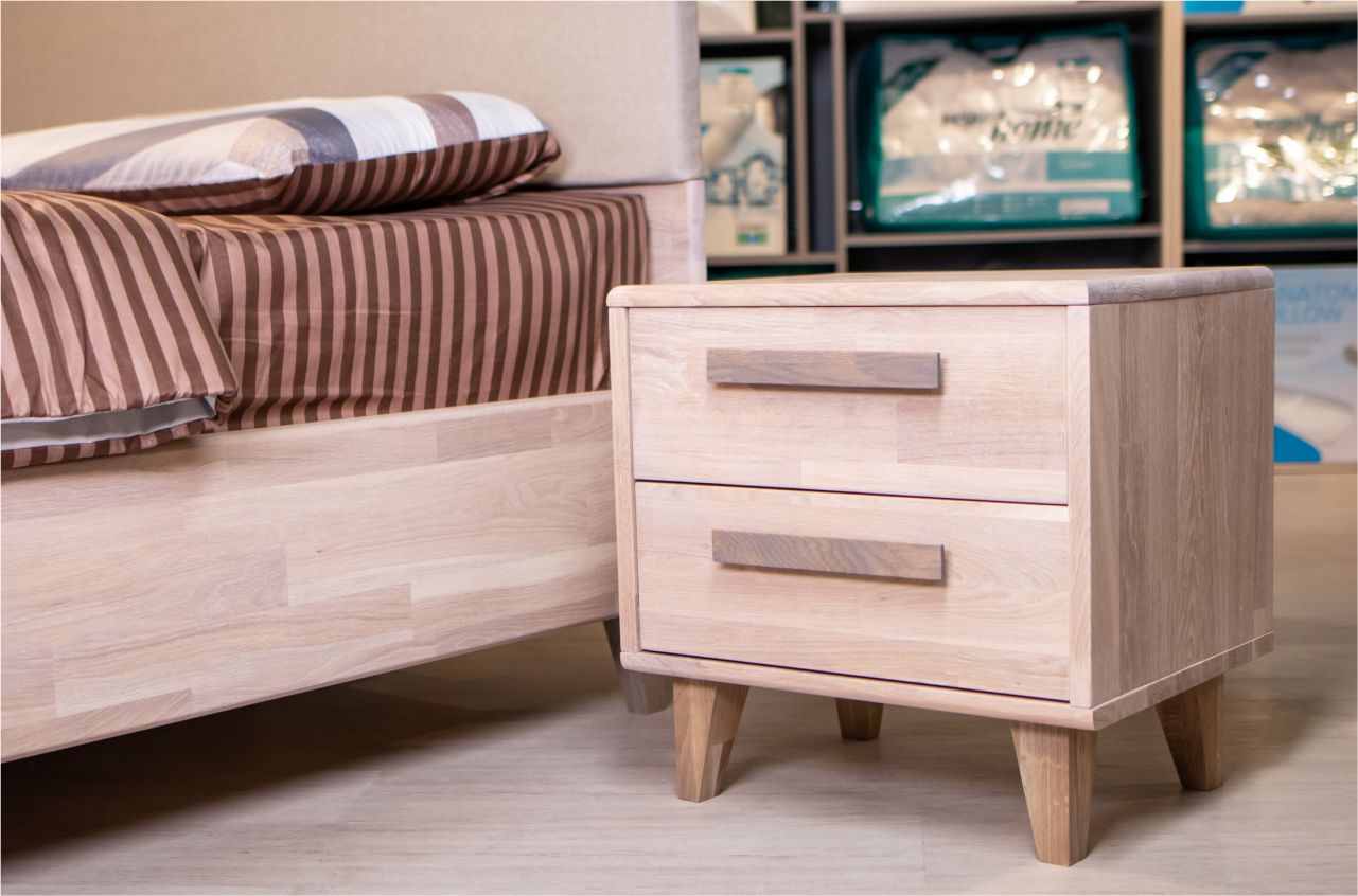 Тумбочка с двумя шуфлядами из массива дуба. Фурнитура скрытого монтажа с доводчиком. Ящики открываются при помощи накладных ручек из массива.