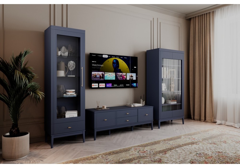 Тумба ТВ из коллекции «Джали» — это сочетание премиальной эстетики и продуманной эргономики. Широкая столешница (1466 мм) позволяет легко разместить телевизор большой диагонали, сохранив при этом место для акустической системы или предметов декора. Глубокий оттенок «Тёмный лазурный» с матовым эмалевым покрытием придает гостиной статусность и современный вид.