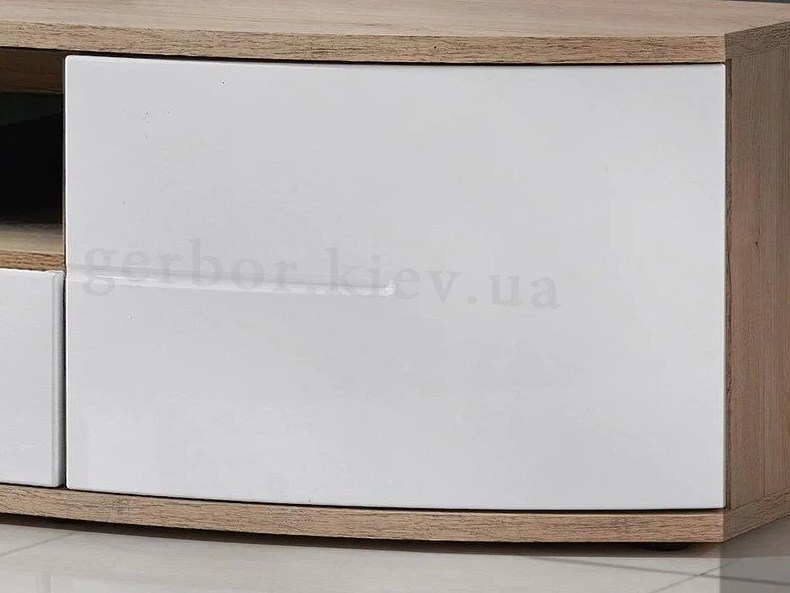 Современная модель тумбы для гостиной. Оснащена открытыми нишами и двумя ящиками.