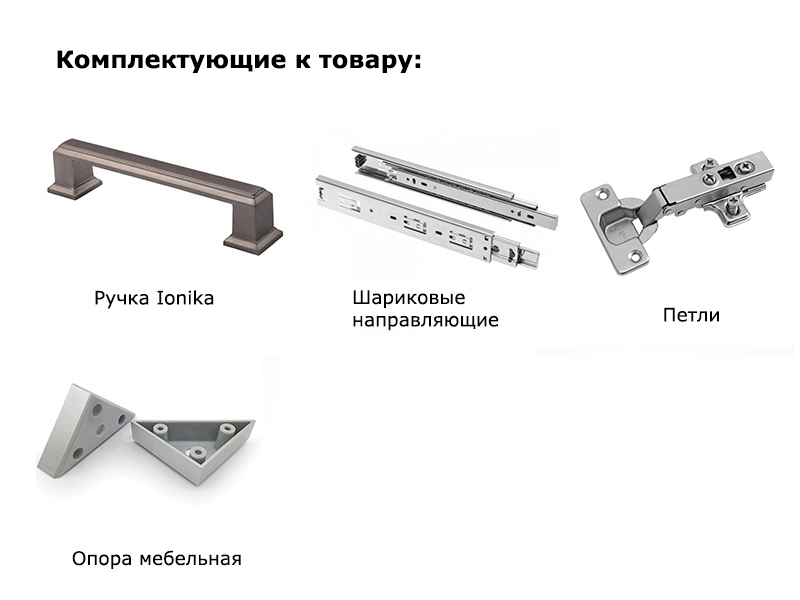 Фурнитура: ручка «Ionika» металлическая (шлифованный титан) 96 мм, шариковые направляющие, опора мебельная, петли дверные.
