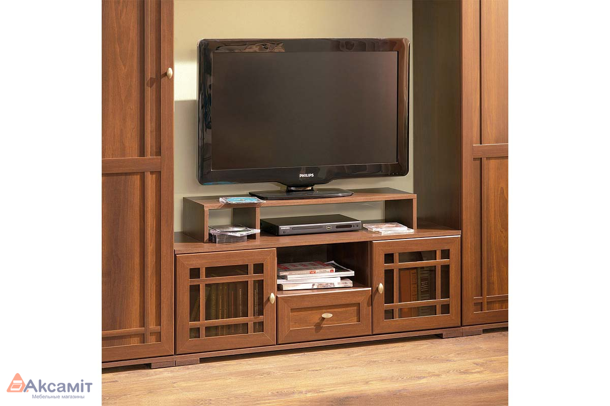 Неглубокая ТВ Тумба в классическом стиле позволит аккуратно разместить в гостиной всю видео и аудио аппаратуру.