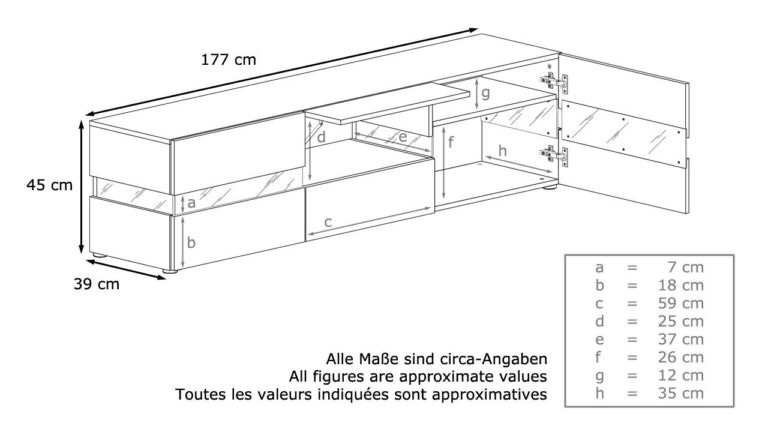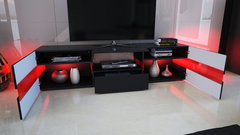 Современная тумба для телевизора с прозрачными вставками, через которые виднеется светодиодная подсветка. Этот эффект весьма удобен, так как заменяет ночник и создает незабываемую атмосферу. На тумбе достаточно места для установки аудиооборудования, а внутри за распашными створками расположен выдвижной ящик и 5 ниш для самых разных нужд.