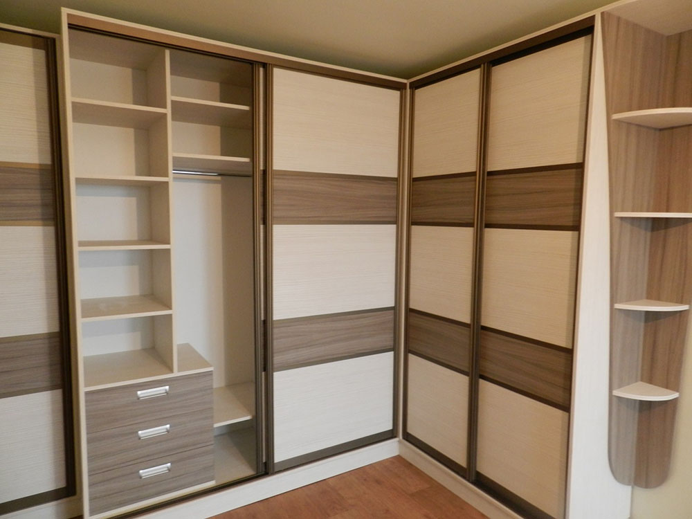 Модель углового шкафа купе представляет собой очень крупногабаритную и вместительную конструкцию, которая оснащена многочисленными полками для вещей и одежды. Фасад выполнен в двух цветах с древесной текстурой: клен и орех, которые необычайным образом дают красивое и приятное сочетание, привнося в дом теплую и уютную атмосферу.