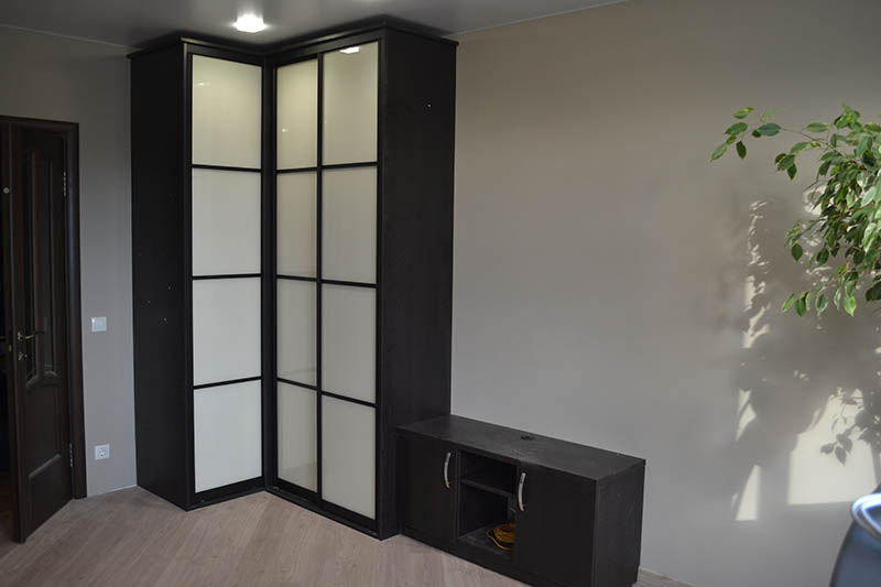 Угловой компактный шкаф-купе в формате створок 2х1. Корпус изготовлен из ДСП, ламинированного под черное дерево, в тон профилю и перегордкам на белом глянцевом фасаде. Дверцы в строгом дизайне изготовлены из цветного непрозрачного стекла. В комплекте для прихожей, на фото, под заказ также была изготовлена двухдверная тумба с открытыми нишами посередине.