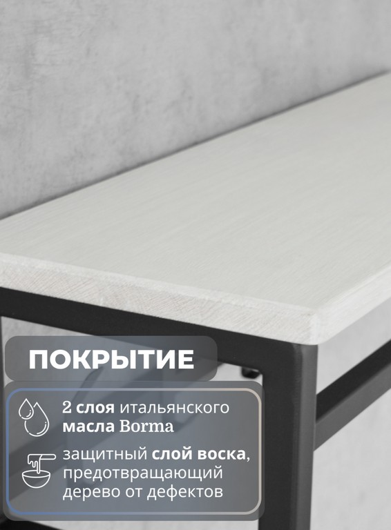 Полимерное покрытие каркаса — устойчиво к воде, царапинам и появлению ржавчины. Полка из массива дуба покрыто двумя слоями итальянского масла и специальным воском, которые позволят столу сохранить свой первоначальный вид на протяжении длительного времени.