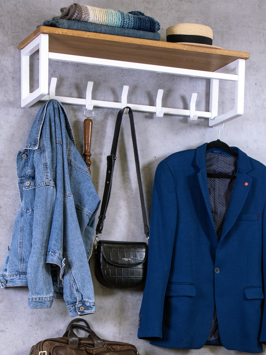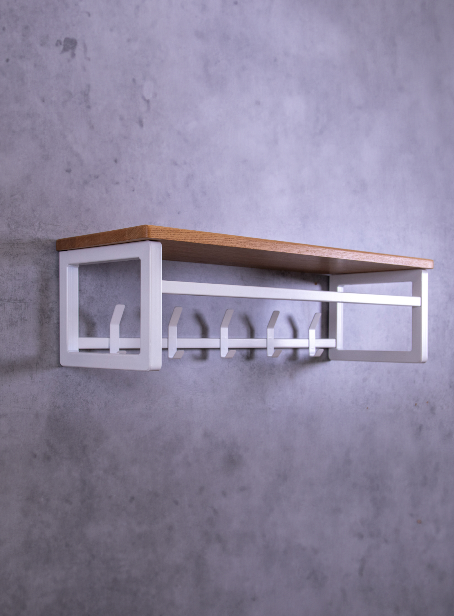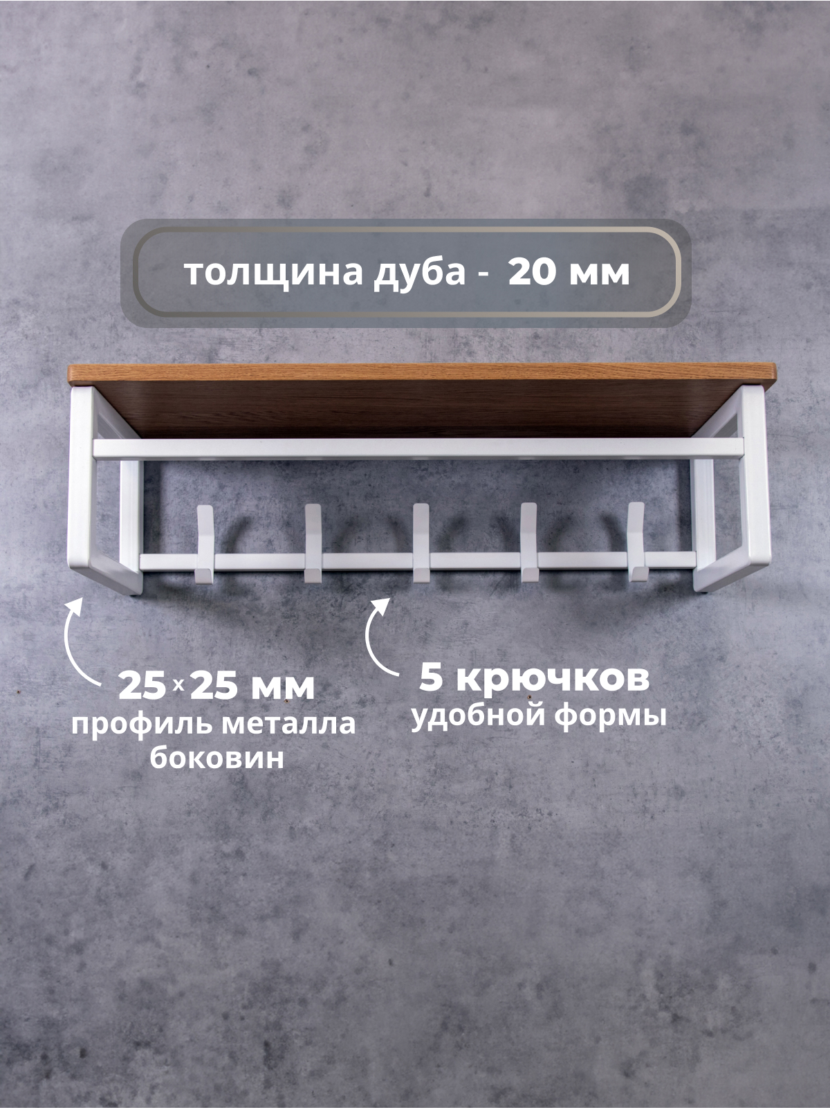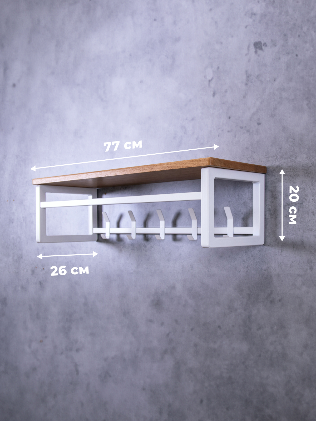 Металлическая вешалка с полкой из массива дуба для прихожей — это отличный выбор для тех, кто ценит практичность и стильный дизайн. Настенная вешалка имеет 5 крючков и полку из массива дуба.