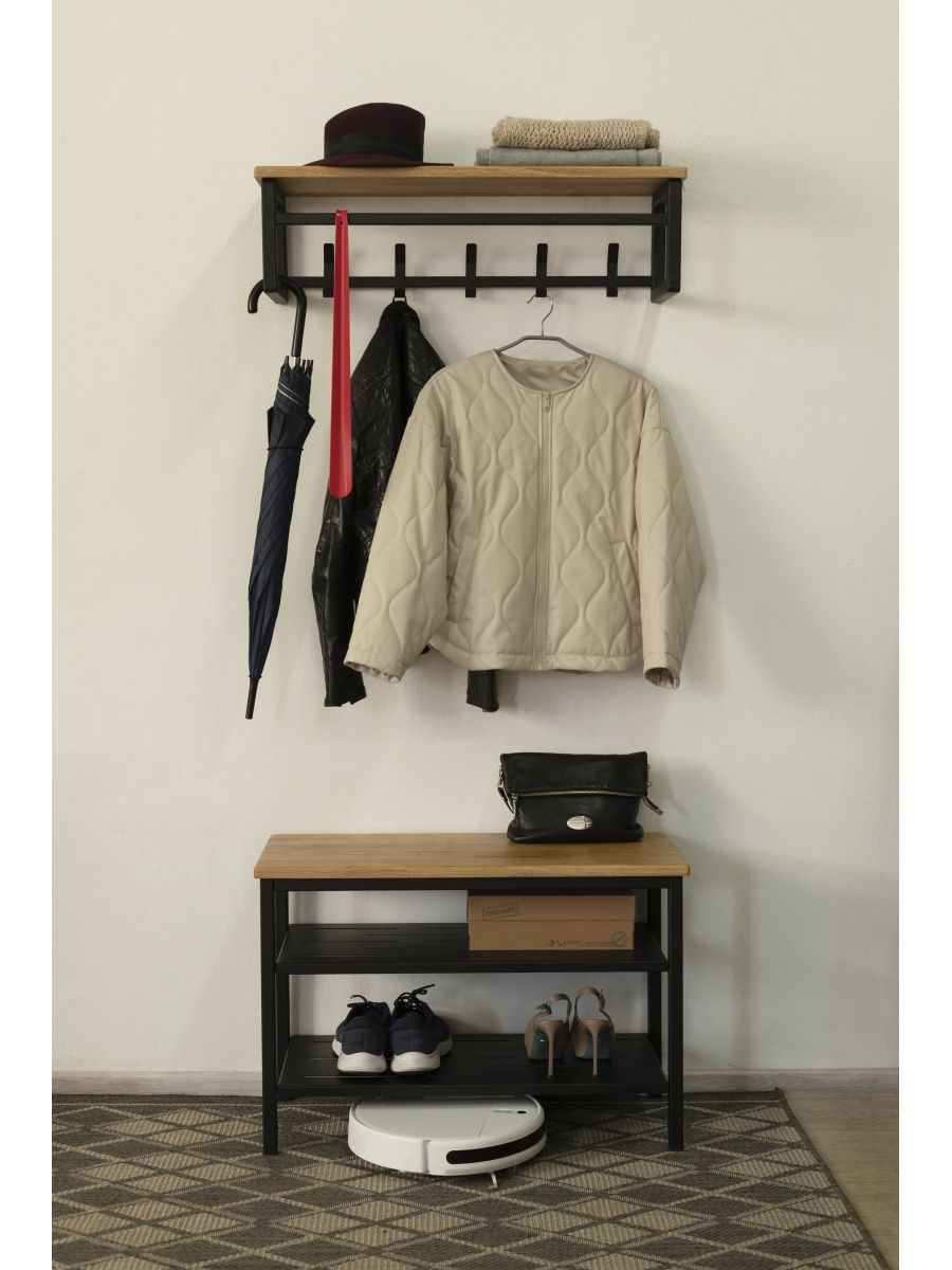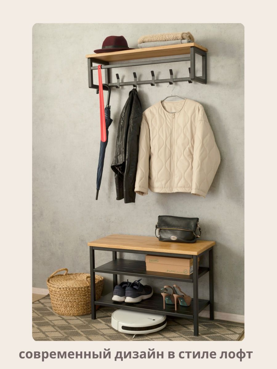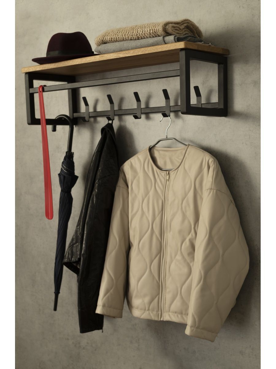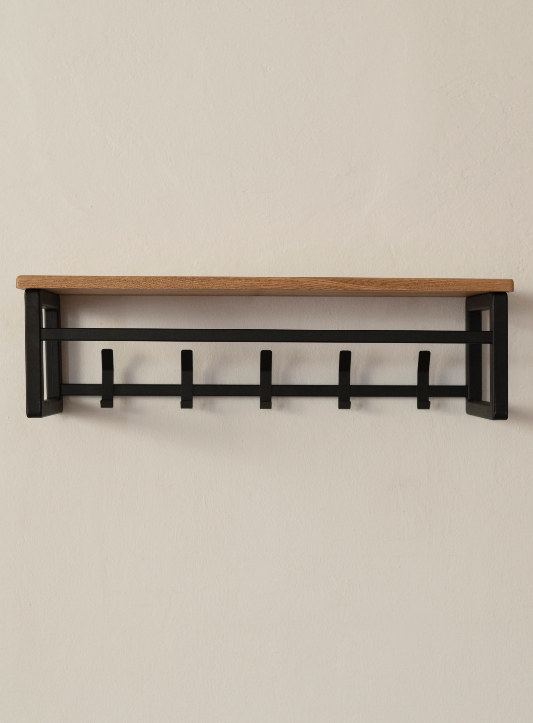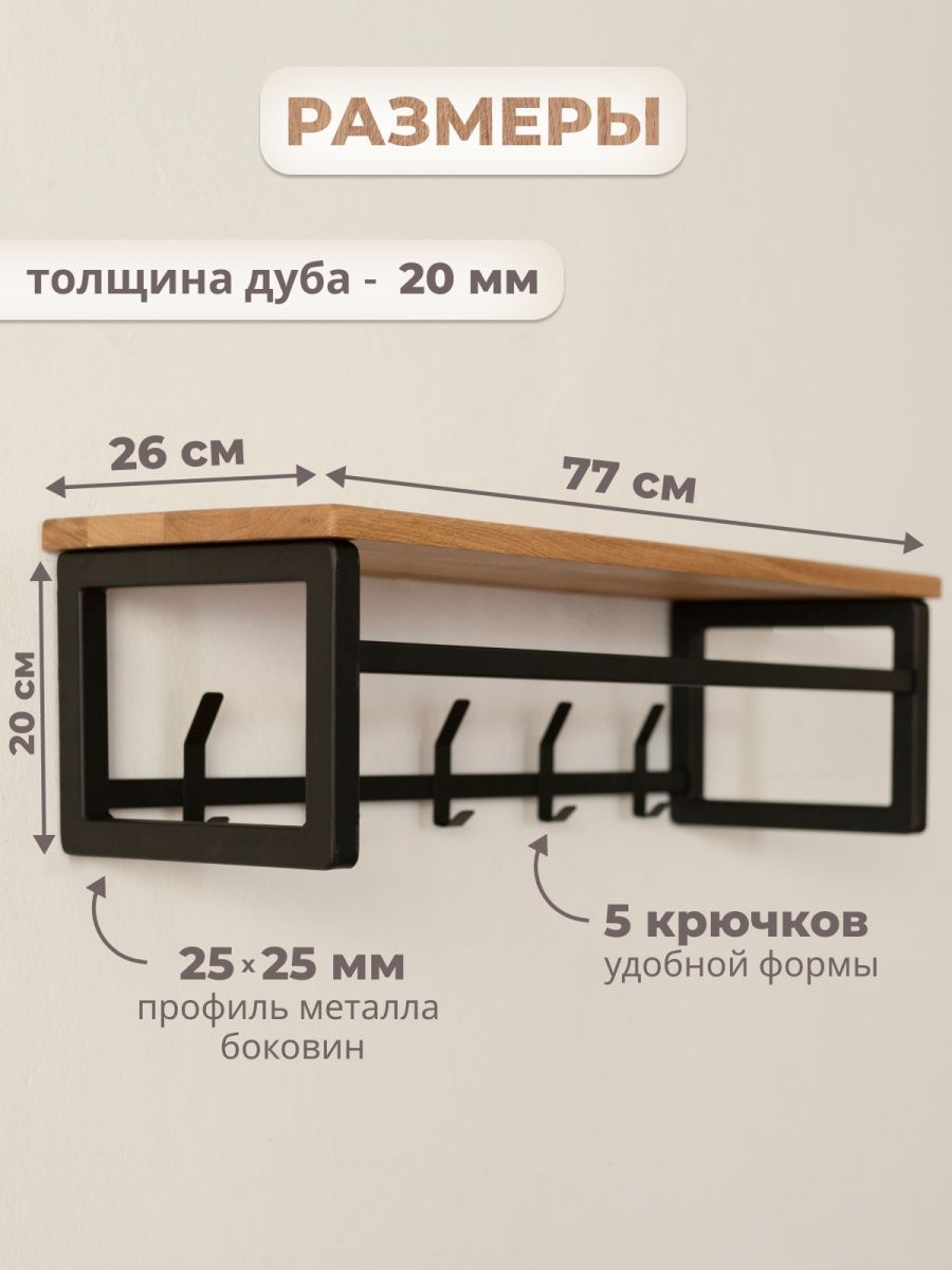 Металлическая вешалка с полкой из массива дуба для прихожей — это отличный выбор для тех, кто ценит практичность и стильный дизайн. Настенная вешалка имеет 5 крючков и полку из массива дуба.