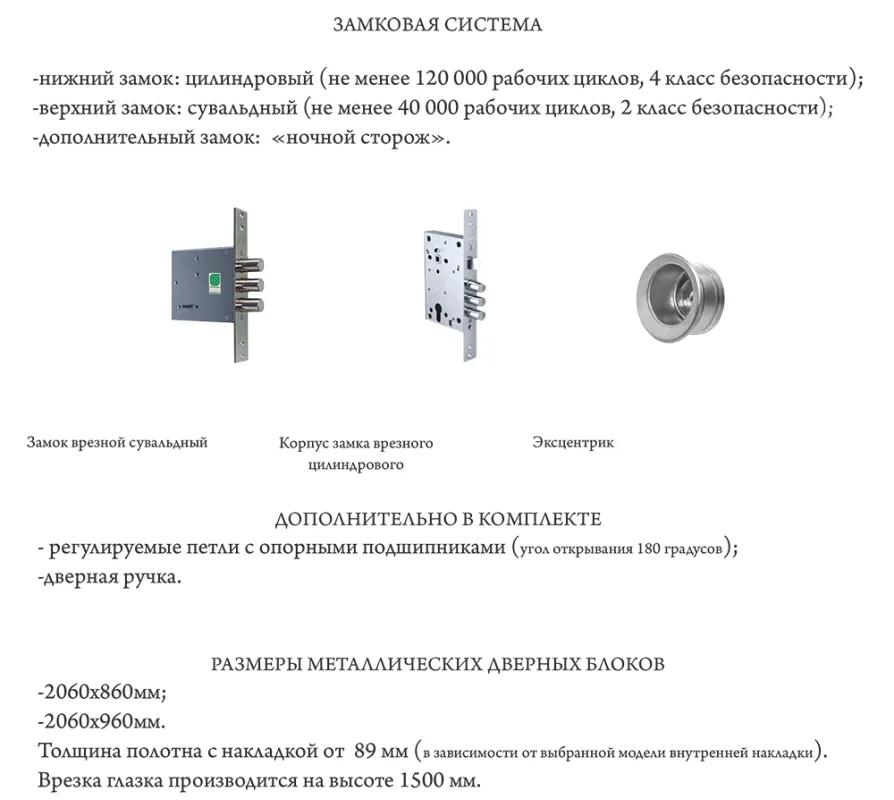 Конструкция двери: коробка и каркас полотна выполнены из оцинкованной стали (толщина — 1,5 и 1 мм соответственно). Дверь имеет 2 контура уплотнения, которые не пропускают в квартиру холод, пыль, запахи и посторонние шумы. За взломостойкость отвечают противосъемные штыри со стороны петель.