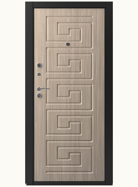 Стальной наличник входной двери «Лабиринт» декорирован накладками из МДФ. В качестве дополнительных элементов в конструкцию включен панорамный глазок и специальная задвижка-ночник.